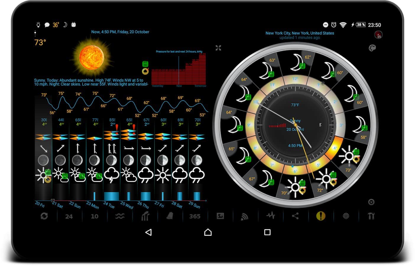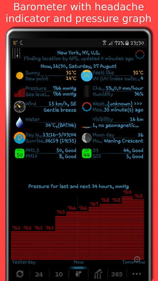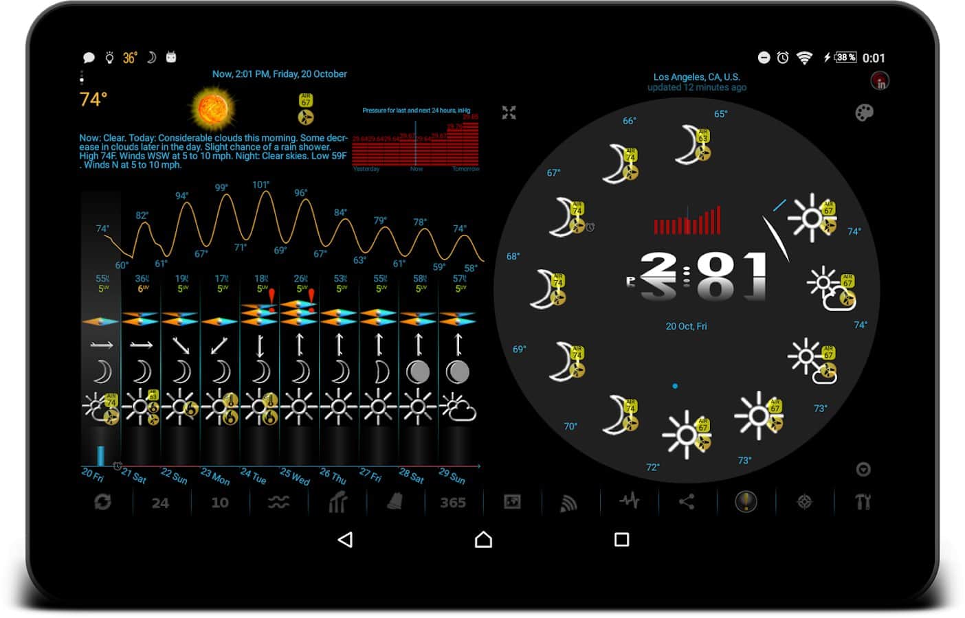 eWeather HD - Прогноз погоды и Барометр для андроид от разработчика Elecont software. Для вас точный прогноз на 10 дней вперед, а так же индикатор различных изменений, что дает возможность планировать отдых или работу заранее с учетом особенностей погодных условий. Изюминкой в приложении eWeather HD являются: дизайн почасового изменения погоды в виде часов и барометр, показывающий изменение давления за 24 часа. Великолепный дизайн, большое количество возможностей и не сложное управление сделает eWeather HD не заменимым помощником для вас в любое время и в любом месте.