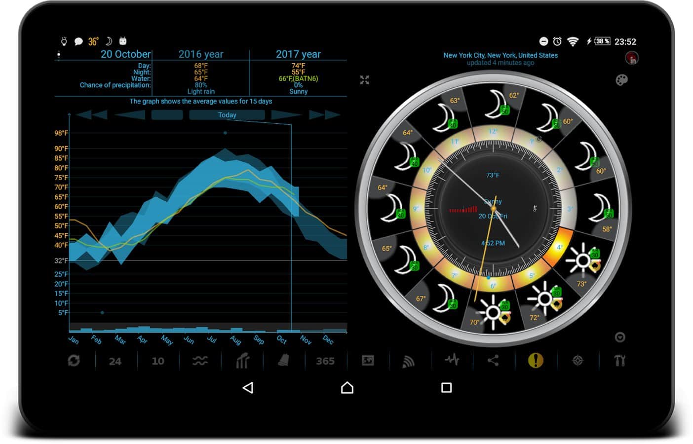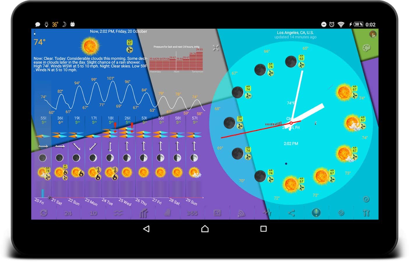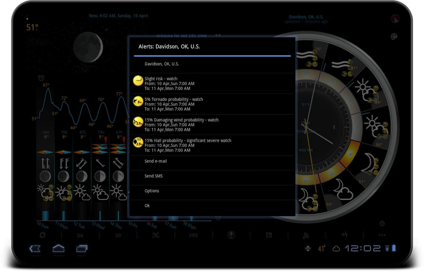 eWeather HD - Прогноз погоды и Барометр для андроид от разработчика Elecont software. Для вас точный прогноз на 10 дней вперед, а так же индикатор различных изменений, что дает возможность планировать отдых или работу заранее с учетом особенностей погодных условий. Изюминкой в приложении eWeather HD являются: дизайн почасового изменения погоды в виде часов и барометр, показывающий изменение давления за 24 часа. Великолепный дизайн, большое количество возможностей и не сложное управление сделает eWeather HD не заменимым помощником для вас в любое время и в любом месте.