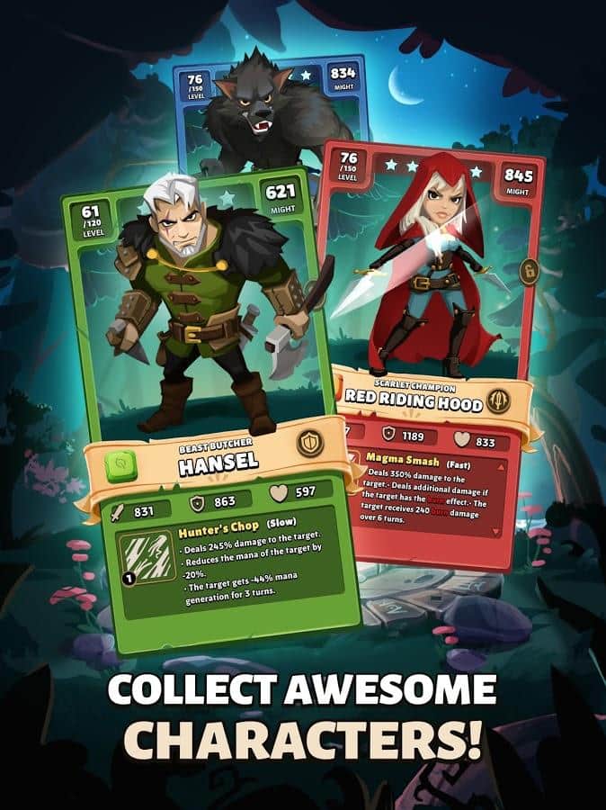 Fable Wars: Epic Puzzle RPG - чарівний ліс не наповнений тільки добром, як розповідається в багатьох казках, глибоко всередині таїться жахливе зло. Переможете його завдяки своїм навиком управління командою з різних характерів і з фантастичними здібностями. Зберіть колекцію карт з чудових героїв, а потім приступайте до розгадки складних головоломок! На жаль, їх навички з часом згасають, тому їх потрібно регулярно розвивати і покращувати. Якщо прості вороги стали вам не перешкодою, зустріньтеся з їх командирами і покажіть на що здатне добро!