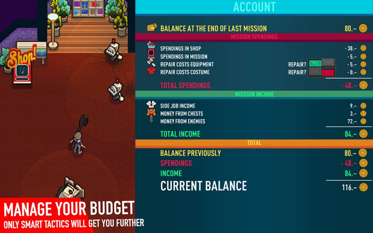 FinanceMission Heroes - досить оригінальна гра, сюжет якої розгортається в альтернативній всесвіту, всесвіту де прогрес дозволив використовувати роботів практично на всіх робочих місцях. Однак, як відомо за все треба платити і ось в один прекрасний день роботи вирішили влаштувати переворот, захопивши всі фінансові рахунки жителів. Колись гармонійному світі почалася паніка, газети рясніли страшними заголовками, підприємства зупинилися і лише один відважний школяр зважився кинути виклик підступним машин. Ігровий процес FinanceMission Heroes поєднує в собі елементи економічної стратегії, вам належить розподіляти грошові кошти на необхідні потреби, розвиток, придбання речей, екіпіровку і інше, причому робити це доведеться вкрай обачно, адже кошти обмежені. Другим напрямком у грі є екшен-РПГ, коли ви вирушите в місто знищувати роботів перетворюючи їх у купи металу.