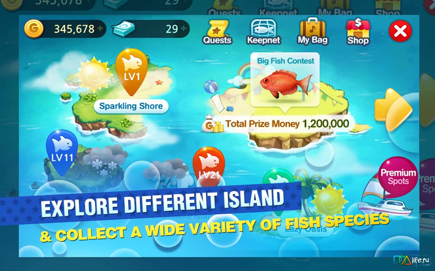 Fish Island - SEA - игра на аndroid, в которой вы будете ловить рыб. На ваш выбор разнообразные удочки и большое количество рыб. Чтобы продемонстрировать свой улов и посоревноваться с друзьями, всех рыб вы можете поместить в аквариум. Также в игре имеется энциклопедия, с помощью которой вы можете просмотреть свой улов и найти там новые виды рыб.