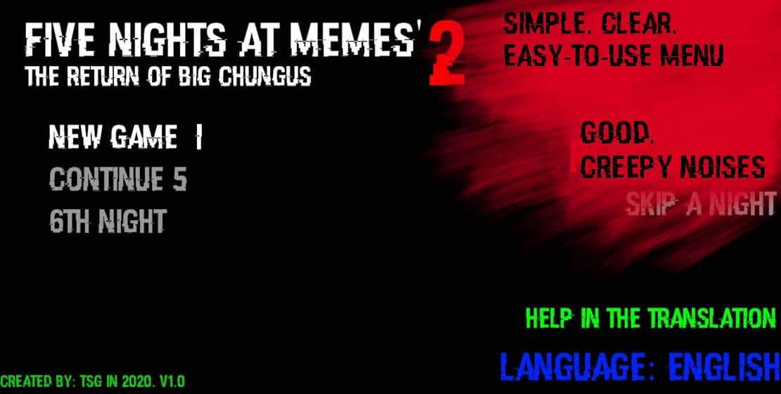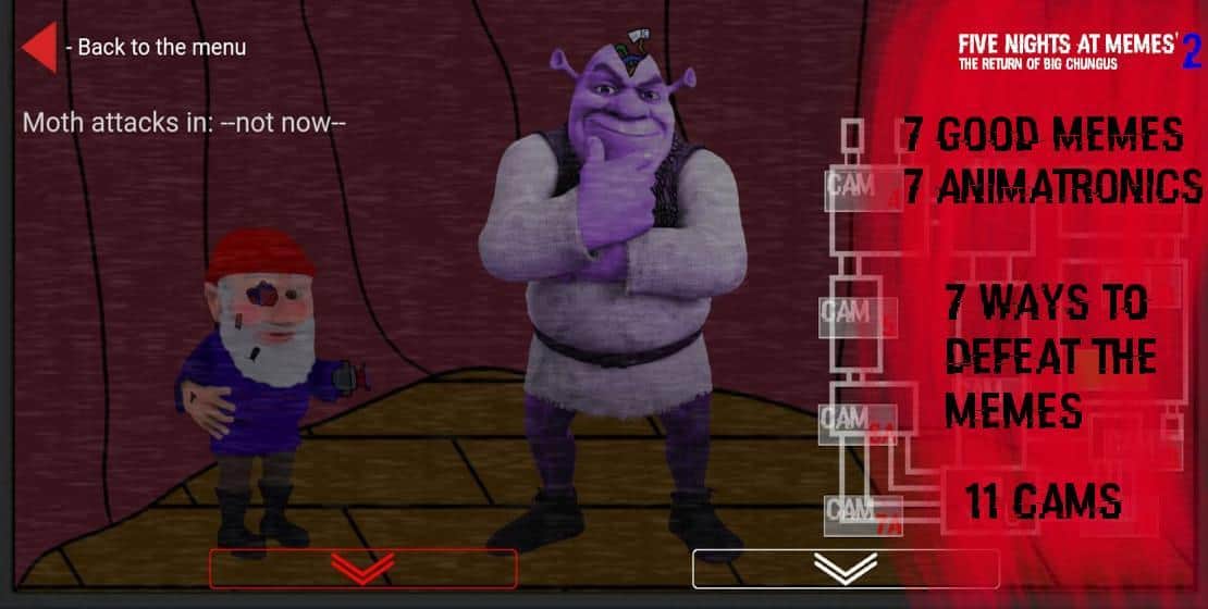 Страшні ночі повертаються, але на цей раз з... мемами! Ви в темному офісі, вам доступні камери, двері і вентиляції. Часто переглядайте відео в реальному часі, щоб знати де знаходяться меми і вчасно закривати для них можливі ходи. З кожною ніччю їх швидкість збільшується, головне прожити до 6 ранку, щоб пройти рівень. Шрек, гном, міль, бегемот вже чекають моменту, коли зможуть налякати вас до швидкої смерті. Обережно: час заряду обмежений, деякі функції без нього пропадуть, намагайтеся економити.