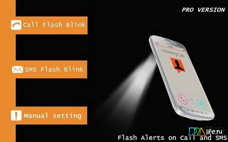 Flash Alerts on Call & SMS – додаток, за допомогою якого можна налаштувати включення і моргання спалаху телефону під час прийому sms і дзвінків. При надходженні виклику, або нового текстового повідомлення, спалах буде блимати. Додаток корисно, якщо у вас стоїть безшумний режим, миготіння спалаху важко не помітити. Легко знайдіть свій телефон в темряві. Особливості: