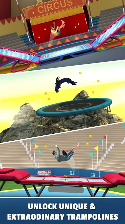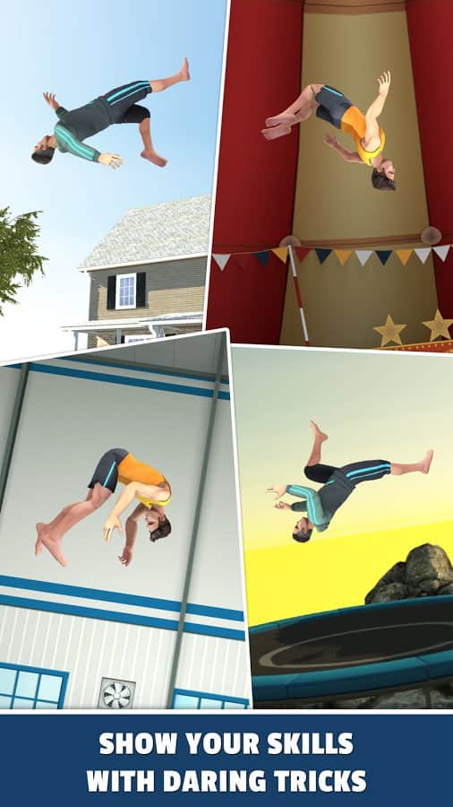 Flip Master – захоплююча гра на андроїд, де ваш герой буде стрибати на батуті. За допомогою одного дотику пальця до екрану телефону або планшета змушуйте свого героя здійснювати стрибки на батуті і робити неймовірні трюки. Вибирайте собі персонажа з душі з представлених в грі та одягайте його в різні костюми, роблячи унікальним. Покадите на ділі свої акробатичні навички і стрибайте на батуті, на задньому дворі, на арені цирку та стадіоні. Отримуйте цінні нагороди та бонуси і встановлюйте свої рекорди в цій грі. Грайте в цю гру і насолоджуйтесь реалістичною фізикою, численними персонажами і 10 складними трюками.