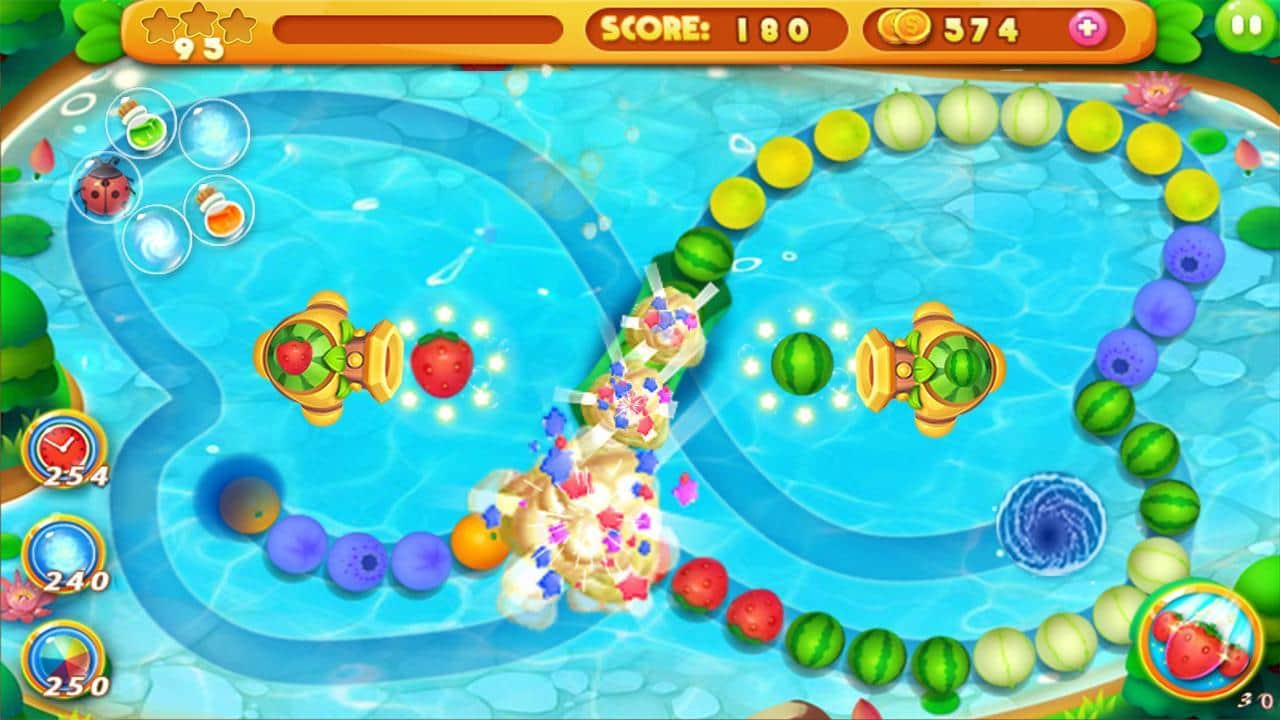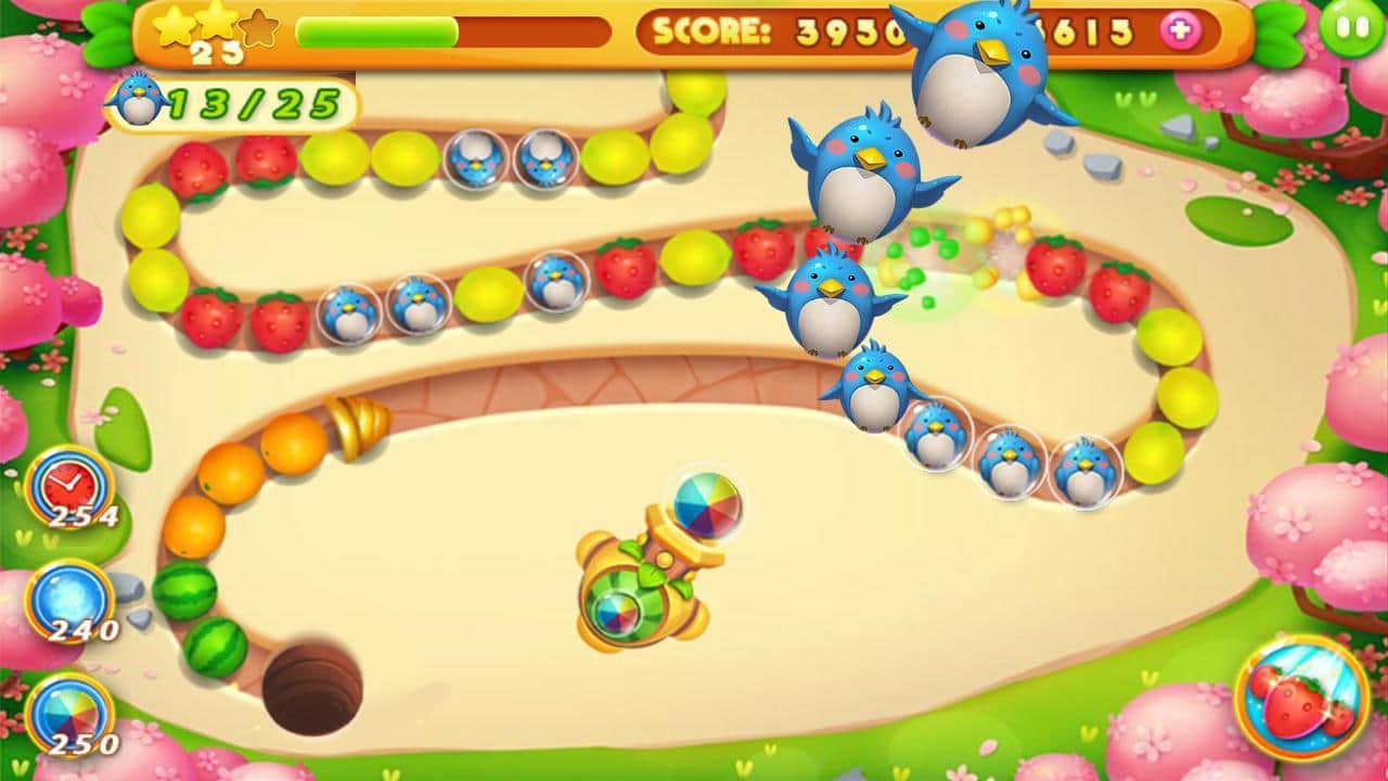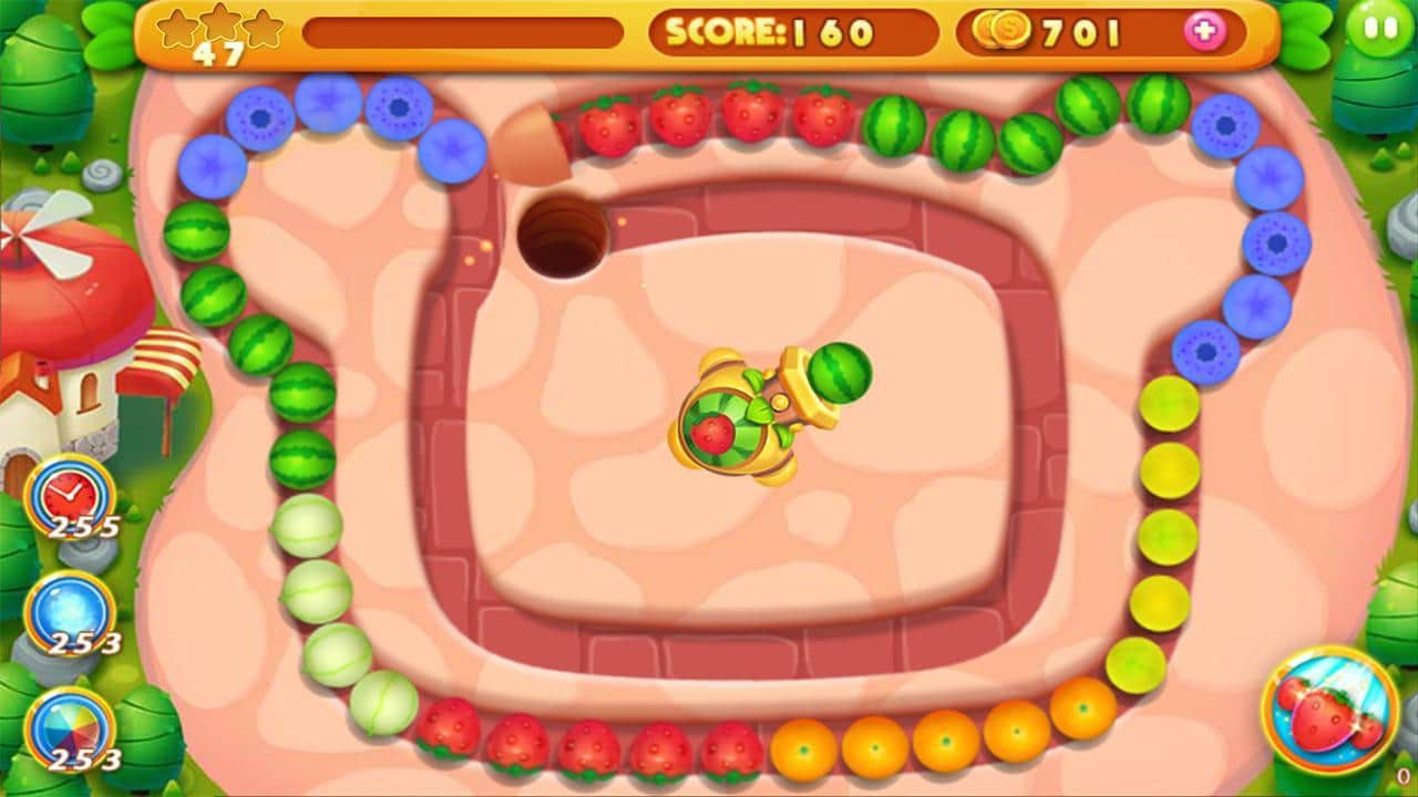 Fruit Marble – формуйте як можна довше ряди з соковитих фруктів і прибирайте їх з поля. У цій грі ви потрапите в казковий світ, що складається з фруктів і ягід, де вашим завданням буде стріляти з гармати різнокольоровими фруктами в рухому ланцюжок. Складайте таким чином якомога довший ланцюжок і висаджуйте її, замеляя рух фруктів до чорної діри. Докладайте всю свою кмітливість і відмінну реакцію, щоб не дати фруктів дістатися до виходу, інакше гра закінчиться і рівень почнеться заново. Попереду вас чекають 108 веселих рівнів, 6 неповторних світів і різні місії по взыванию фруктів.