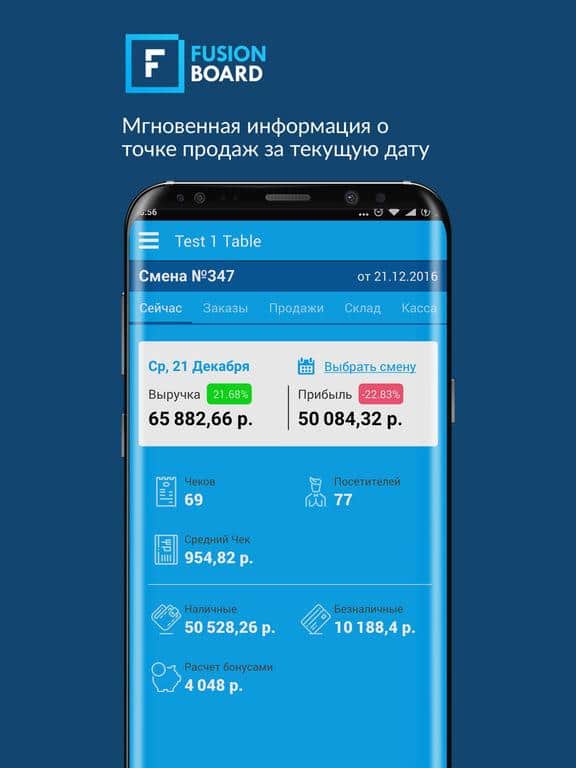 Fusion Board призначається для бізнесменів, які володіють кав'ярнями, барами, ресторанами, кафе чи магазинів. Якщо ви ставитеся до їх числа, а також використовуєте систему автоматизації Fusion POS , то обов'язково встановити цей додаток. Воно дозволить вам стежити за станом справ у вашому закладі з будь-якої точки земної кулі. Ви зможете дізнаватися останні новини про кількість відвідувачів у своєму закладі, залишках товару на складі, про замовлення, про те, скільки грошей було отримано за день та іншу необхідну інформацію.