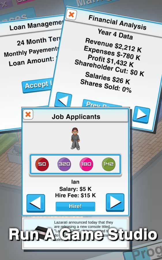 Game Studio Tycoon для Андроїд це бізнес симулятор в якому вам належить взяти під своє начало невелику фірму по розробці програмного продукту і привести її на вершину ігрової індустрії. Розробники Game Studio Tycoon дещо відійшли від звичних канонів бізнес симуляторів і обмежили часовий проміжок ігровими 40 роками. За цей час вам і належить розвинути свою імперію. Для цього у вас будуть всі можливості, розробка ігор на більш ніж 40 ігрових платформ, найм і навчання персоналу, укладання контрактів і інші економічні аспекти, все це ляже на ваші плечі. Як вже говорилося Game Studio Tycoon виконана в ретро стилі і без сумніву сподобається всім шанувальникам цього популярного жанру.