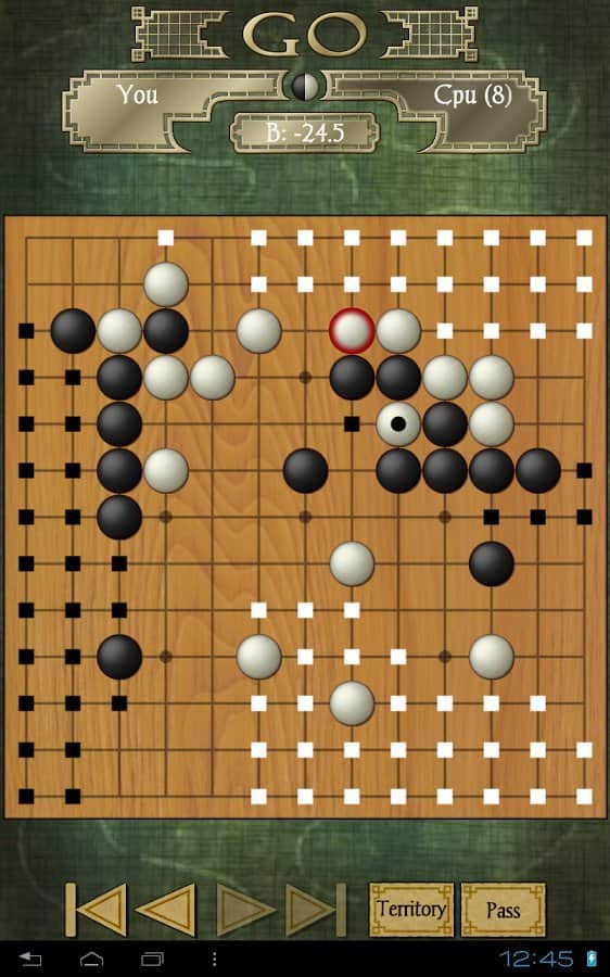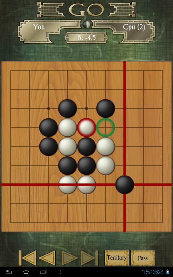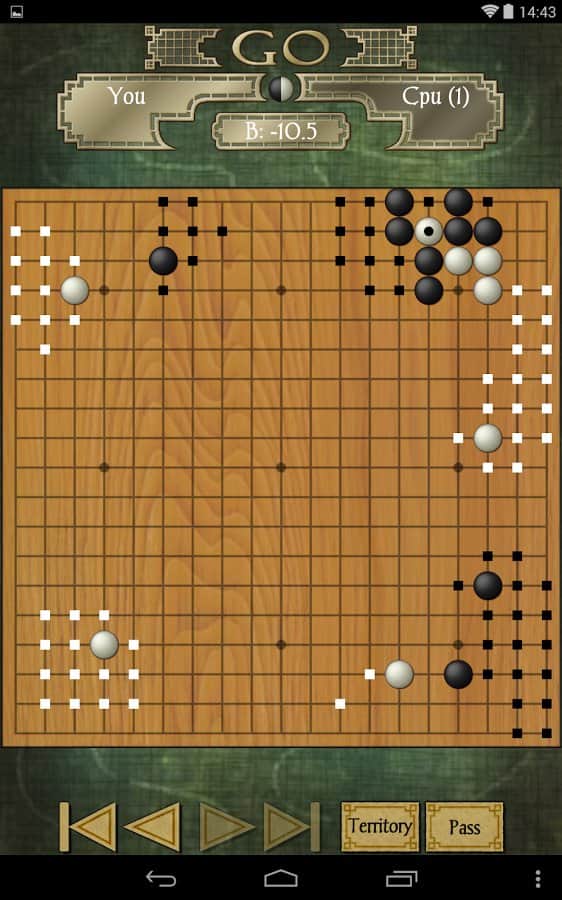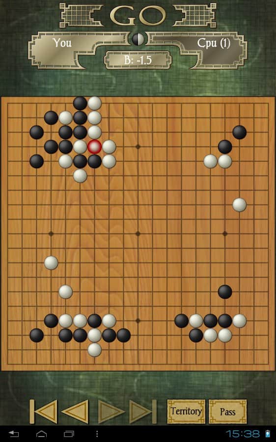 Go – логічна гра на андроїд, яка прийшла до нас з Азії. У цій грі перед вами виявиться поле, на якому ви повинні розміщувати свої камені так щоб захопити якомога більшу територію, ніж у вашого суперника. Кожному гравцеві дається хід, за який він може розмістити лише один камінь на ігровій дошці, який повинен розташовуватися на перетині ліній з допомогою яких розкреслена дошка. Ретельно продумуйте кожен свій хід і захоплюйте більше територій, прибираючи з поля камені свого суперника отримуючи над ним величезну перевагу. У грі представлено кілька видів гральних дощок, різні рівні складності і безліч підказок і бонусів.