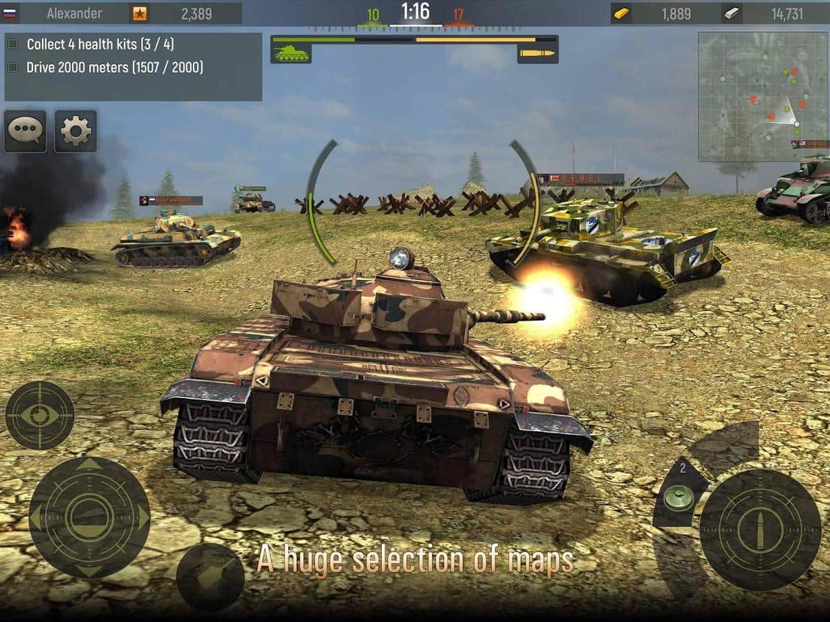 Grand Tanks: Tank Shooter Game – прийміть участь в танкових баталіях що проходять на різних картах. У цій грі ви візьмете під свій контроль танки різних епох і виробників і перевірити їх у справі. Управляйте броньованою машиною і ведете її вперед, знищуючи всіх супротивників у себе на шляху. Уважно стежте за картою і вистежують свого супротивника, першим відкриваючи по ньому вогонь. Стріляйте по танках суперників намагаючись потрапляти в найвразливіші місця. Відкривайте для себе нові танки, отримуйте цінні нагороди та звання і спілкуйтеся в загальному чаті з іншими гравцями і союзниками.