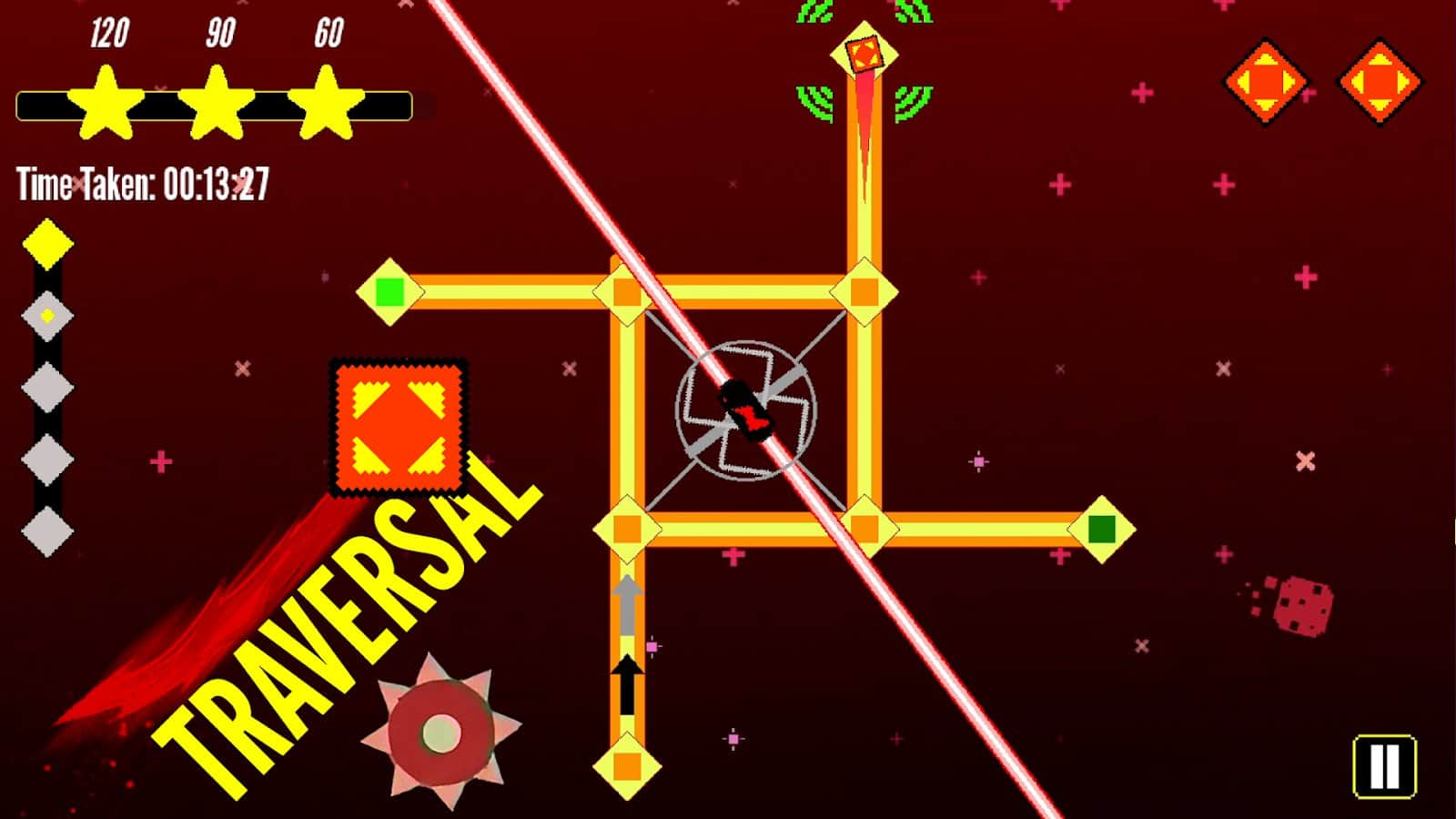 Режим Перехід - гра на точність і швидкість. Перевершуйте небезпечні рівні, наповнені пастками, мінами та лазерами, щоб досягти фінішу якомога швидше, зберігаючи слайсер в безпеці.