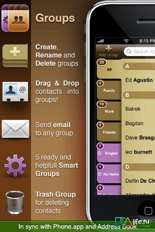 Groups: SMS, Mail and Manage Contacts - відмінне додаток для роботи з масивами та групами контактів. Створюйте, видалення, перейменування групи, надсилайте групам смс, контактів однієї групи або кількох груп! Насолоджуйтеся зручним інтерфейсом і можливостями - пошук контакту за номером, по імені, по групі та ін. Простота, зручність і користь - це 3 складові хорошого додатка!