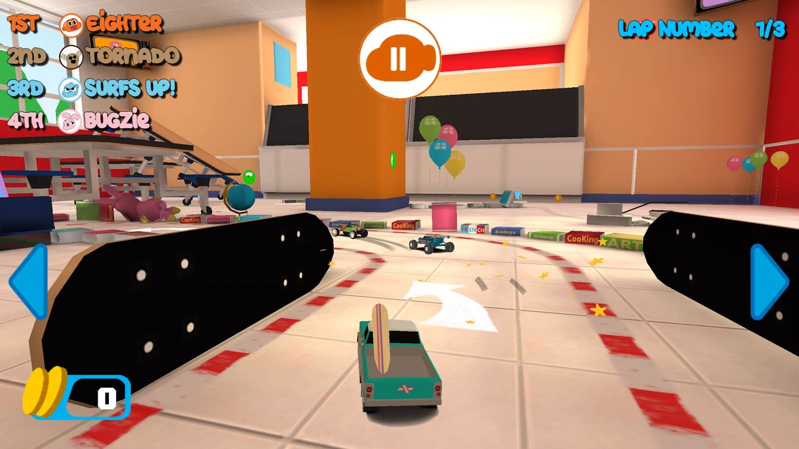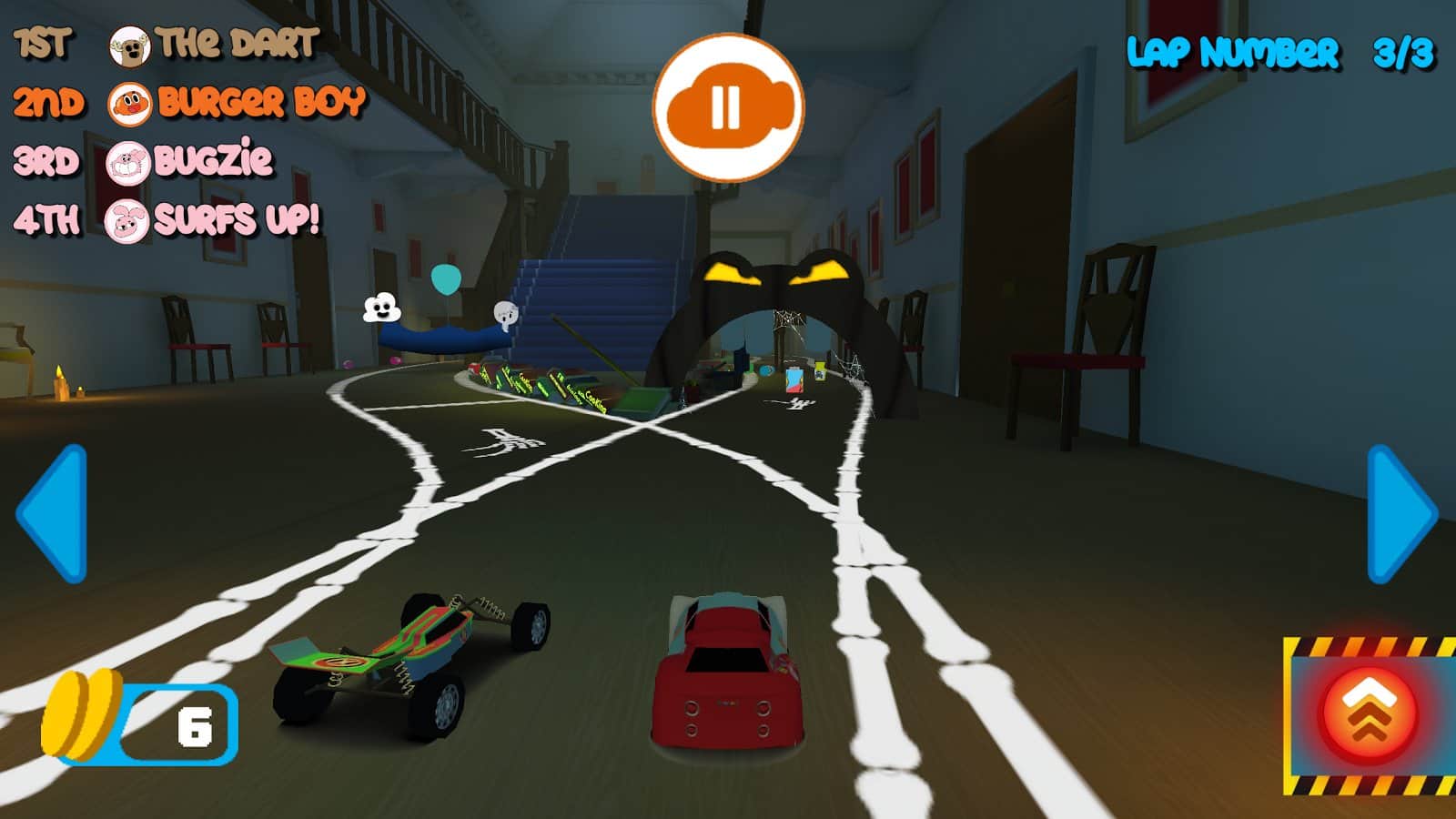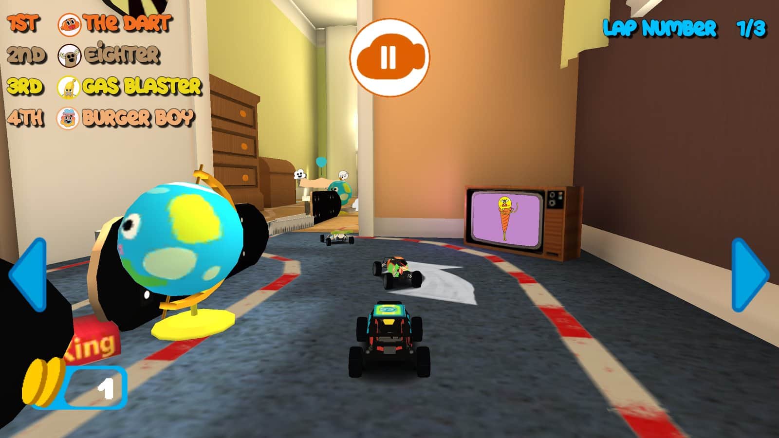 Gumball Racing – в цій грі ви візьміть участь в різних гонках, що проходять на іграшкових машинах. Вибирайте собі машину з численних представлених в грі і керуйте головними героями гри, таким як Габмол або Дарвін. Ведіть свій автомобіль по різних трасах, що проходять в різних кімнатах будинку. Тисніть на педаль газу до упору і обганяйте суперників, прийшовши до фінішу першим. По шляху свого проходження не забувайте збирати численні бонуси і обходити перешкоди, виконуючи неймовірні трюки.