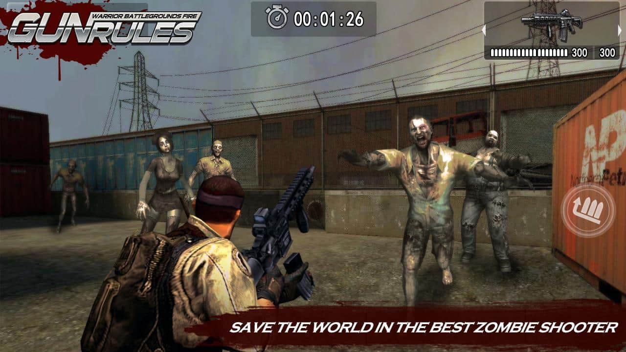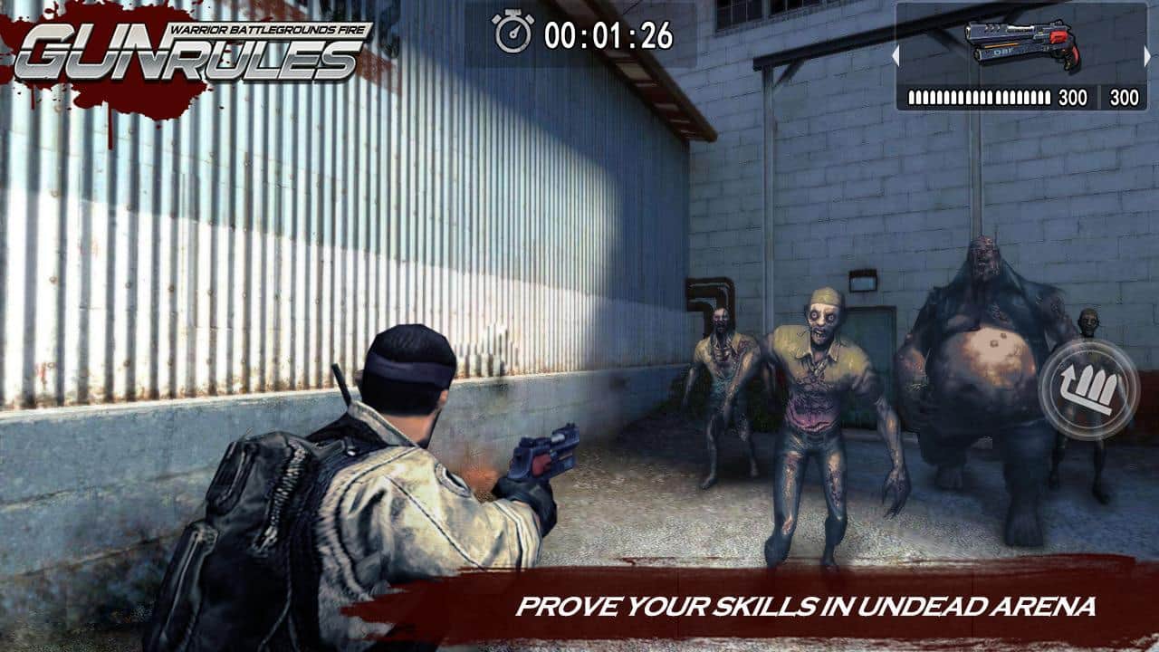 Gun Rules : Warrior Battlegrounds Fire – екшен від третьої особи для андроїд, дії якого будуть проходити в туманному місті. Ваш загін був відправлений в таємничий місто для знищення терористів. Усіх членів вашої команди знищили жахливі чудовиська, і вони перетворилися в зомбі. Тепер вашим завданням буде прокласти собі безпечний шлях крізь натовпи зомбі і спробувати покинути це місто живим. Знищуйте зомбі з допомогою потужного зброї і виграйте війну проти ходячих мерців. Враховуйте те, що зомбі в цьому місті мають велику швидкість і хорошу реакцію. Дослідіть локації і знищіть всіх зомбі.