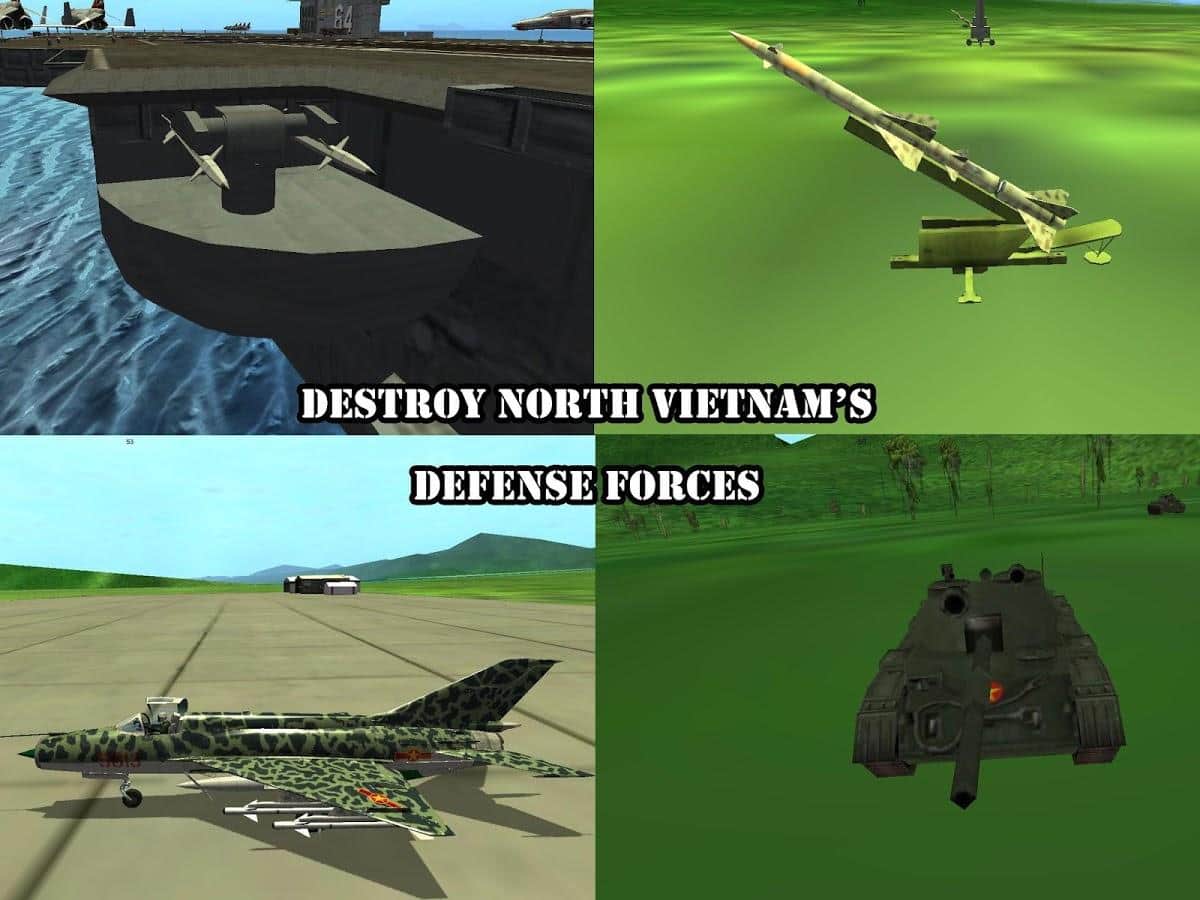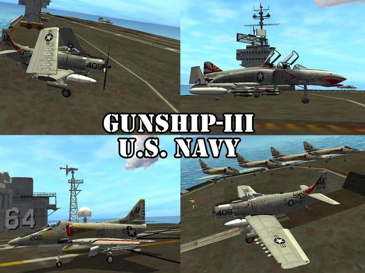 Gunship III - U.S. NAVY - Продолжение линейки игр по серии Gunship на андроид. Эта игра является дополнением к третьей части игры, действия которой проходят во вьетнаме. Вам немного расширили арсенал – добавили Flyable A-1 Skyraider, A4E Skyhawk и F4B Phantom II. Как и раньше, вас ждет взлет и посадка с палубы авианосца ВМС США. Игра проходит в более-менее реалистичном трехмерном мире.
