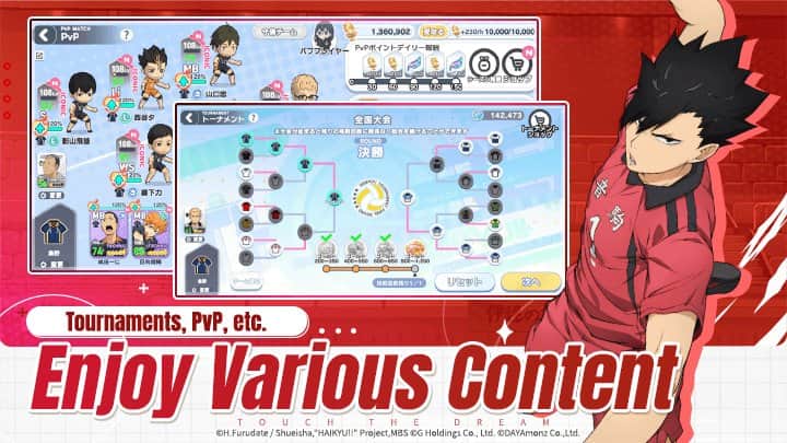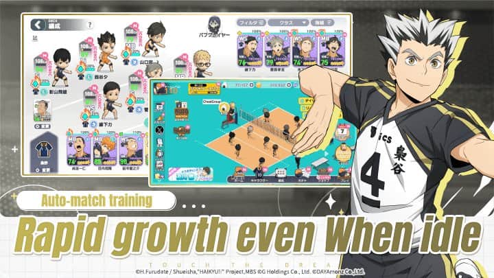 HAIKYU!! TOUCH THE DREAM - Гравці волейбольного клубу об'єднуються з рішучістю та пристрастю до гри, щоб долати труднощі, розвивати свої навички та досягати блискучих перемог. Познайомтеся з персонажами з оригінального твору, включаючи гравців шкіл Карасуно, Некома, Аоба Джосай та інших. Сформуйте свою ідеальну команду та змагайтеся з найкращими. Використовуйте стратегічні комбінації навичок та передбачайте дії суперників, щоб здобути перемогу.