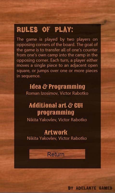 Halma - У цієї гри дуже проста задумка, ви повинні дістатися з одного кута дошки в інший, при цьому кожен гравець зможе переставити тільки одну фішку за раз. І тут вам вже доведеться підключити всю вашу кмітливість. Адже ви можете перестрибувати кілька своїх фішок поспіль, а це означає що вам потрібно розробити власну стратегію. Хто перший з гравців займає протилежний кут, той і переміг. Ви можете грати проти комп'ютера з різними рівнями складності, або ж грати проти іншого гравця на одному пристрої. Дана гра розвиває мислення, і буде корисною для будь-якого віку.