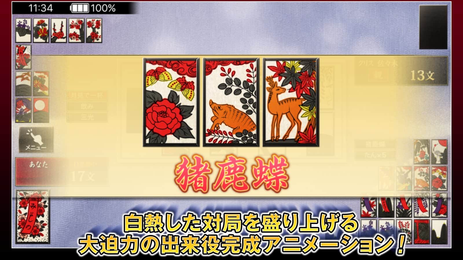 Hanafuda Playing Cards – карткова гра на андроїд, яка прийшла до нас з Японії. Назва цієї гри дослівно перекладається як «продовжуй» це слово повинен вимовляти якщо гравець хоче продовжити гру. Головним завданням у цій грі буде зібрати з наявних у вас на руках карток певні комбінації. По ходу гри відбуватися безперервна роздача карт і якщо у одного з гравців збирається відповідна комбінація, він може зупинити гру і заробити очки, або продовжувати і зібрати ще більш високу комбінацію карт, яка має велику цінність. Грайте проти розумного комп'ютера і набирайтеся досвіду, отримуючи як можна більше очок.