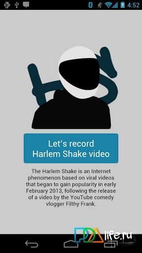 Harlem Shake Creator – прикольная программа для андроид устройств от разработчика Kirill Ivashchenko, с помощью которой вы можете снимать видеозапись в стиле Harlem Shake. Для того, чтобы вы не запутались в управлении, приложение содержит подробную пошаговую инструкцию, есть возможность сохранения в собственную библиотеку, содержит оригинальную музыку и, наконец, отличная возможность загрузки видео файла сразу после его создания в YouTube.