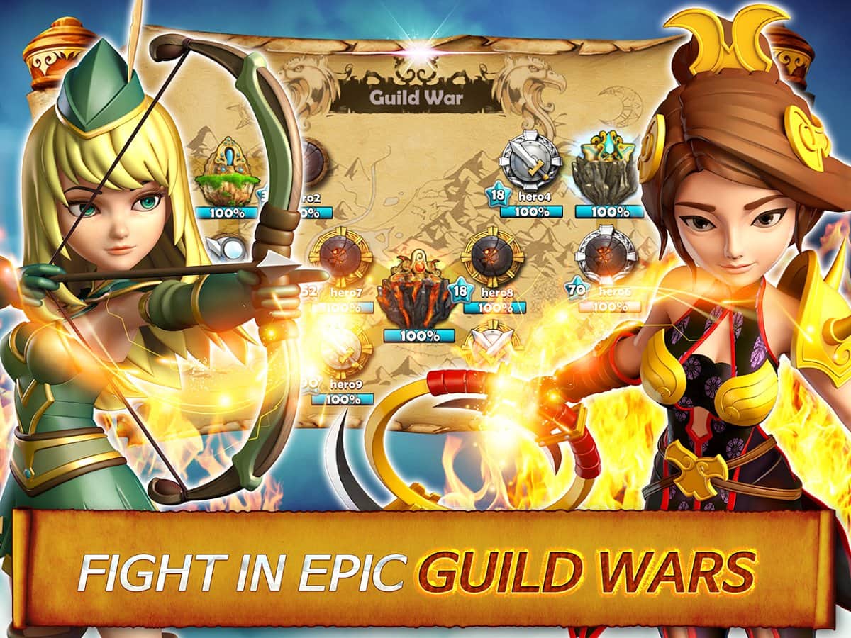 Hero Sky: Epic Guild Wars – стратегія для андроїд, в якій ви вирушите на вершину Олімпу і там будете битися справжніми героями та богами. У цій грі ви будете боротися за право зайняти трон головного правителя на Олімпі. Виберіть собі підходящого героя і пориньте в безжальні битви декількох суперників. Побудуйте своє село і удоскональте її великими фортецями і парканами. Вступайте в могутні гільдії з іншими гравцями і допомагайте один одному у масових боях з ворогами піднятися якомога вище в рейтингу Небесного світу. Застосовуйте хитрі пристосування у вигляді троянського коня для швидкої перемоги над ворогом і наймайте в свою армію мешканців пекла для оборони свого села. Боріться і перемагайте один бій, за іншими досягаючи режиму люті, де ваші війська стануть воістину непереможними.