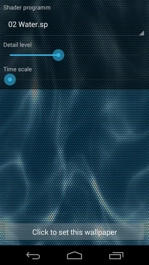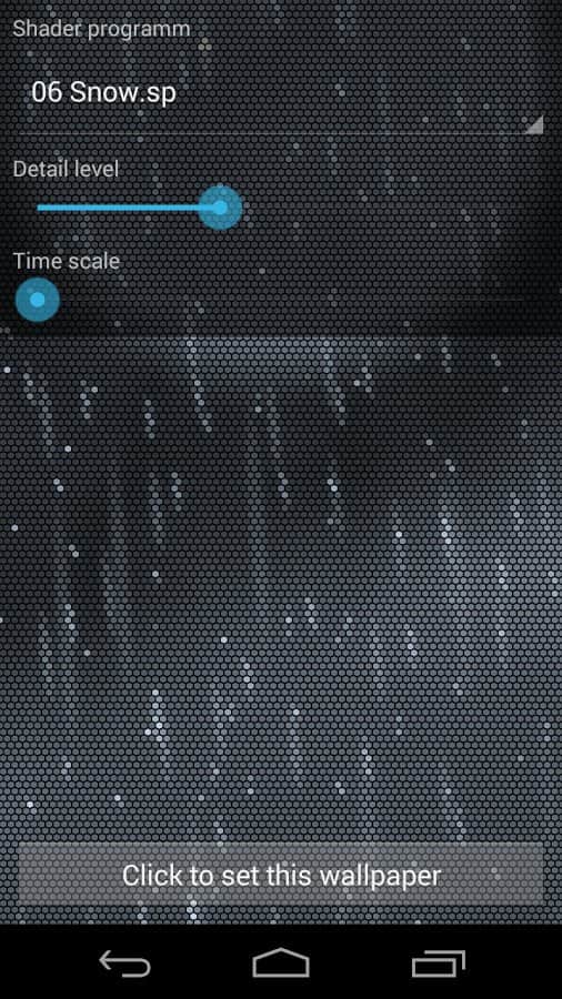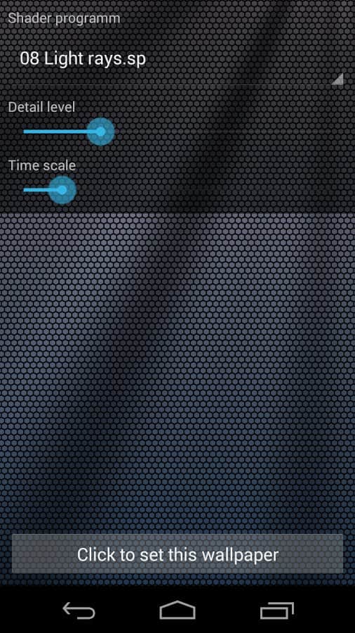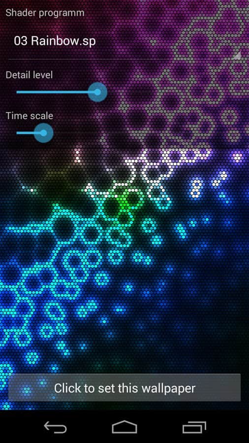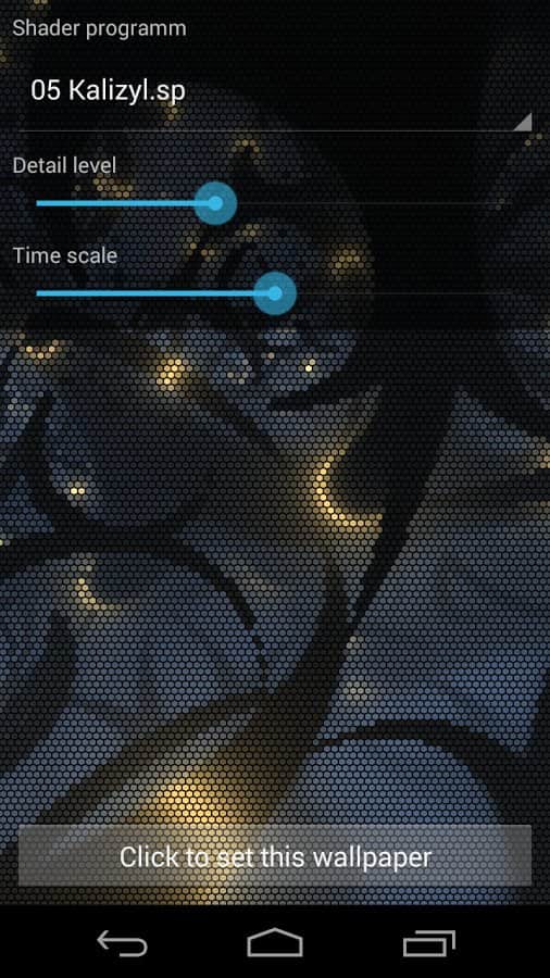 HexShaders – живі шпалери з каталогом шейдерних програм на андроїд. Встановивши ці шпалери у свій телефон або планшет ви зможе підібрати для себе неповторні шпалери, які будуть унікально відображатися на екрані, враховуючи вашу продуктивність пристрою. Вибирайте з 12 програм підходящу вам і з допомогою налаштувань встановлюйте швидкість анімації і деталізації. Насолоджуйтесь приємними шпалерами, які занурять вас в дивовижний світ абстракції, де ви зможете спостерігати подібність дощу, комети, різні завихрення і перетікання квітів. Спостерігайте за всім, що відбувається на вашому екрані і задійте на всю продуктивність пристрою.