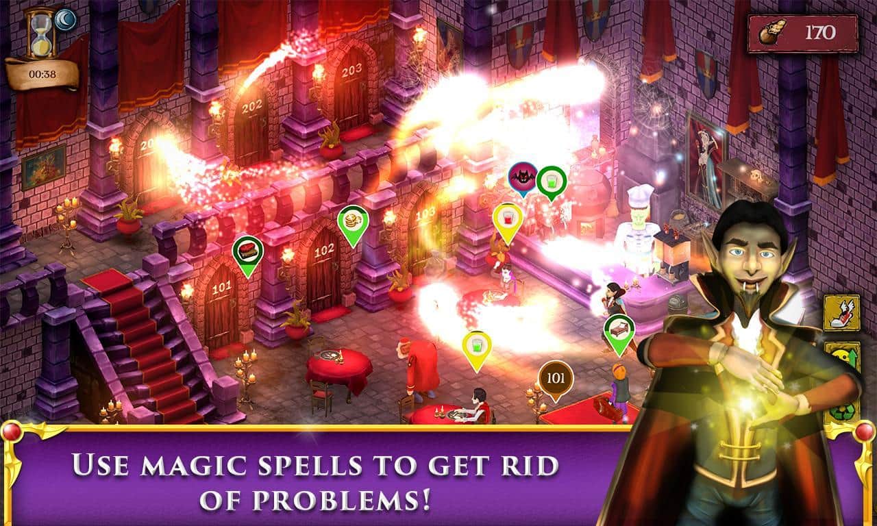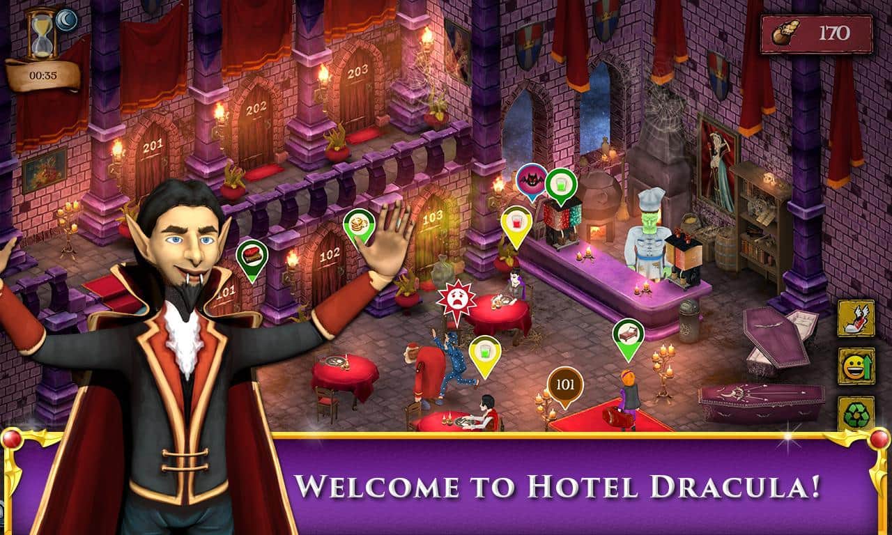 Dracula Hotel – захоплююча гра на андроїд, де ви відвідаєте готель Дракули. У цій грі ви будете виступати в ролі обслуговуючого персоналу, на плечі якого лягає велика відповідальність за оформлення і розселення відвідувачів за номерами, так само вам необхідно буде забиратися в номерах і наводити там лад. Приймайте замовлення і розносить їжу приїжджим гостям, вивозите сміття і віддавайте накази. Також у цій грі ви зможете скористатися чарівними заклинаннями, які допоможуть вам в годину пік тримати ситуацію під контролем. Проходьте захоплюючі місії і вирішуйте непрості завдання, грайте в міні-ігри і добийтеся відмінних результатів у цій грі.