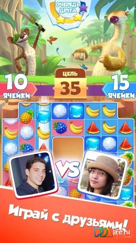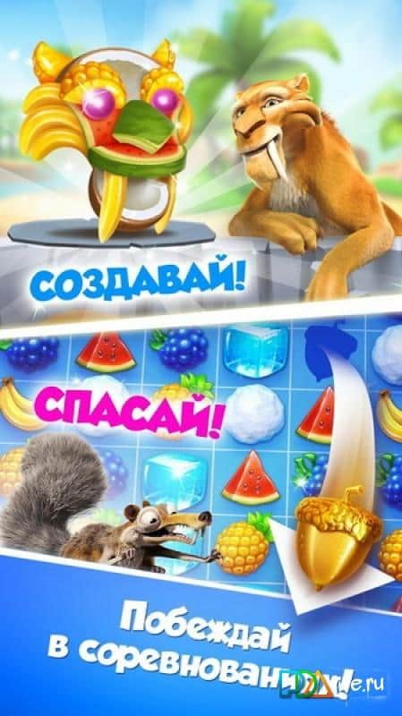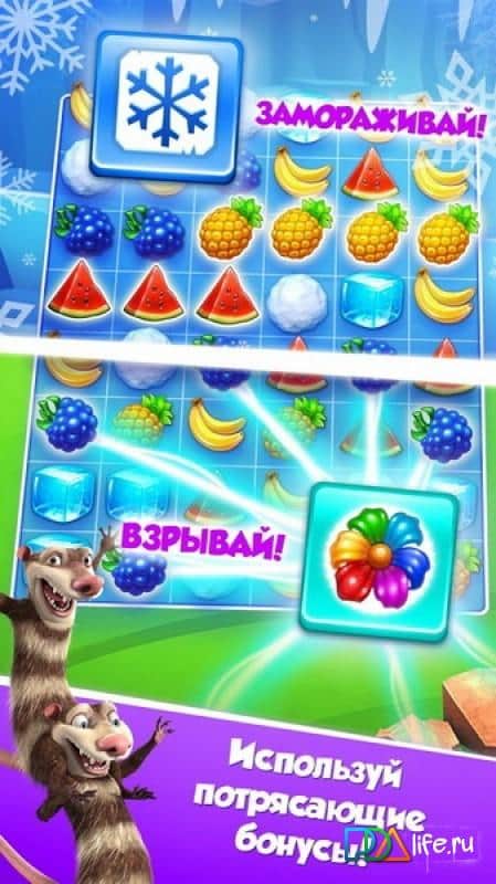 Ice Age Avalanche – всеми полюбившийся мультик вновь оказывается на экранах ваших мобильных android девайсов в виде отличной казуальной игры, которая поможет вам приятно скоротать своё время. Игра представляет собой жанр «три в ряд», но обладает своими фишками и особенностями. Смысл игры как и во всех играх этого жанра сводится к тому чтобы передвигать фрукты так чтобы они собрались в один ряд, как только три и более одинаковых фрукта соединятся они исчезнут. Вступайте в сообщества и не пропускайте еженедельные акции с возможностью получить интересные призы. Приятной игры!