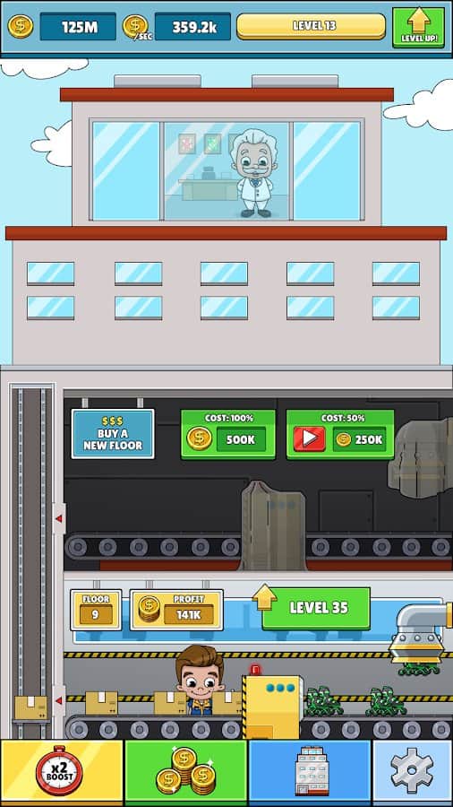 Idle Box Tycoon - Incremental Game Factory – клікер на андроїд, де ви будете керувати величезною фабрикою і заробляти мільйони. У цій грі вашою головною задачею буде керувати фабрикою, виробляти різноманітні товари і розширювати їх кількість і найменування. Слідкуйте за рухом конвеєра, по якому рухаються різні об'єкти, вам необхідно натискати на них і упаковувати в коробки відправляючи замовникам. Отримуйте чудові бонуси за пройдені рівні і отримуйте в нагороду нових працівників, які будуть виконувати всю вашу роботу. Розширюйте і розвивайте свою фабрику і купуйте нове обладнання і транспорт.