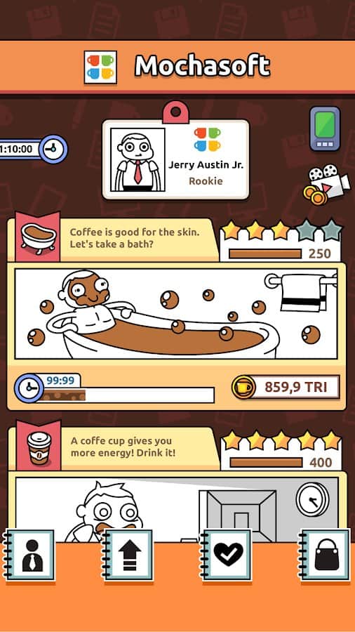 Idle Coffee Inc. - Caffeine Rush Simulator Clicker – клікер на андроїд, де ви будете керувати головним героєм, який п'є каву. Наш герой хоче досягти відмінних результатів на своїй роботі і піднятися якомога вище по кар'єрних сходах. І для цього йому необхідна енергія, яку він черпає з кави, так що приготуйтеся як можна частіше натискати на екран свого телефону або планшета щоб змусити героя пити каву і відповідально виконувати свою роботу. Не допускайте зниження кофеїну в крові героя і випивайте як можна більше чашок кави в день. Гра порадує гравців чудовою мальованої графікою і легким керуванням.