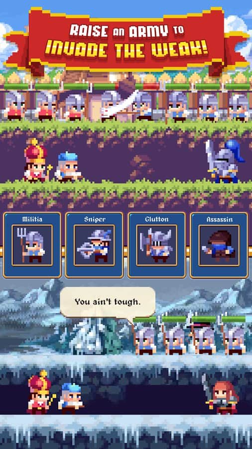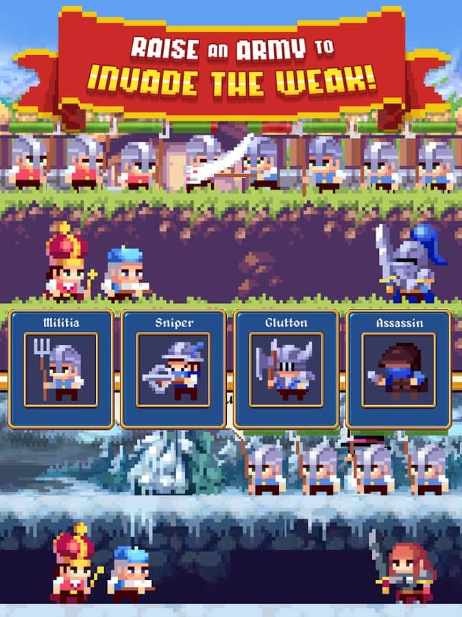 Idle Empires – захоплююча гра, де ви будете допомагати жорстокому тиранові Норману завоювати владу у всьому світі. У цій грі король Норман хоче перетворити маленьке королівство у величезну імперію і підкорити всі довколишні держави. Наш герой жадає лише одного – влади і багатства допоможіть йому збагатиться. Перетворюйте своє королівство у військовий табір і побудувати на місці житлових будинків шахти з видобутку золота, а на місці каплиць і церков в'язниці. Зберіть свою непереможну армію, що складається з лучників, лицарів і тюремників і нападайте на сусідні держави, завойовуючи їх. Запобігайте різні і численні революції і захистіть короля від смерті.