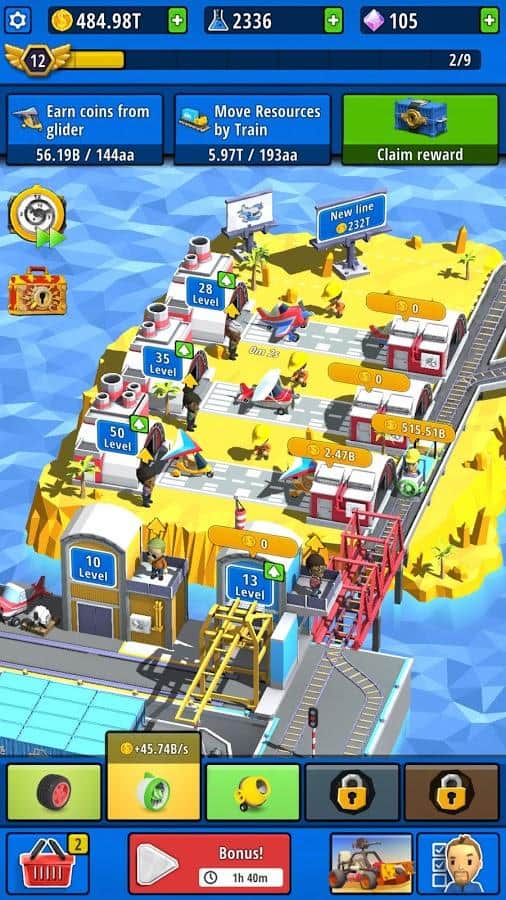Idle Inventor - Factory Tycoon - побудуйте власний завод на невеликому острівці, щоб виробляти транспорт будь-яких моделей (машини, літаки, ракети, вертольоти, трактори) і заробляти величезну кількість грошей. Наймайте кращих менеджерів для поступової автоматизації процесу і тільки спостереженням за тим, що відбувається. Покращуйте придбані механізми, регулярно відкривайте нові потоки, не пропускайте спеціальні пропозиції з кращими шансами на гроші і досвід, проходите дивовижні завдання і насолоджуйтеся веселим проведенням часу.