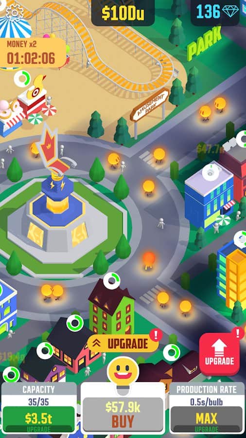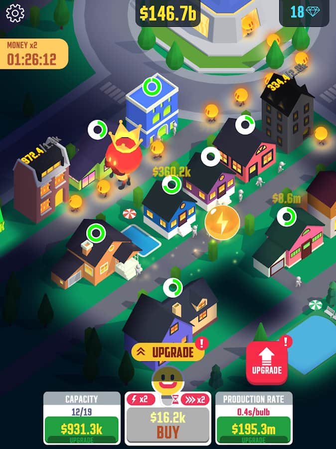 Idle Light City - одного разу, з невідомої нікому причини величезний місто занурилося в пітьму. На вулицях немає жодного ліхтаря, а сонце ніби забула про його існування. Тобі належить допомогти місту вибратися з темряви, пролий світло на його прекрасні будинки, парки розваг, фабрики і магазини. Висвітлюй кожен куточок містечка і заробляй все більше грошей. У твоєму розпорядженні ціла фабрика лампочок, натисніть на екран, щоб виготовляти більше. Купуй поліпшення для свого міста і фабрики, розширюй територію виробляй більше лампочок і покажи всьому світу який прекрасний місто криється у темряві.