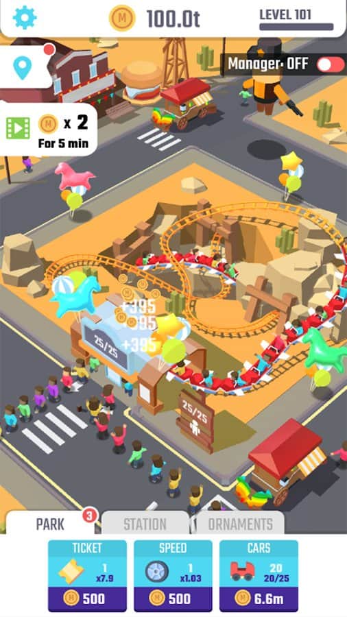 Idle Roller Coaster – цікава гра на андроїд, де ви будете створювати власний парк розваг. У своєму парку ви будете будувати різні по складності атракціони і запрошувати нових відвідувачів. Почніть з невеликих гірок і каруселей і закінчите екстремальними видами, які будуть приводити відвідувачів в захват. Розвивайте і розширюйте свій парк і досягнете світової популярності і слави. Продавайте їжу і напої на території парку і отримуйте додаткову вигоду і гроші, які ви зможете витратити на будівництво нових розваг. Грайте в цю гру і насолоджуйтеся відмінною графікою, численними об'єктами і простим управлінням.