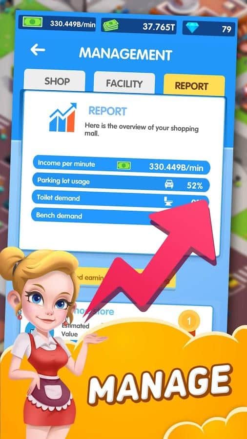 Idle Shopping Mall – гра-клікер на андроїд, де ви будете керувати власним торговим центром. Почніть свій бізнес з невеликого кафе і поступово розширюйте його до величезного торгового центру. Заробляйте гроші і відкривайте магазини, пекарні, ресторани та інші потрібні людям відділи. У вашому розпорядженні буде більш 400 видів магазинів. У своєму торговому центрі ви зможете розмістити безліч відділів і товарів щоб кожен відвідувач зміг знайти те, що йому необхідно. Розширюйте і всіма способами покращуйте свій бізнес і залучайте нових клієнтів зручними лавками і комфортними туалетами. Клікайте як можна частіше на екран свого телефону або планшета і стаєте найбільшим магнатом.