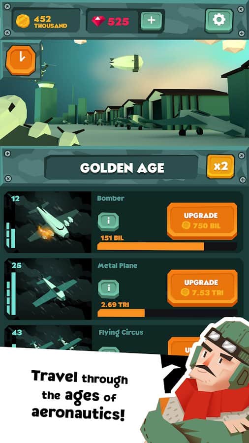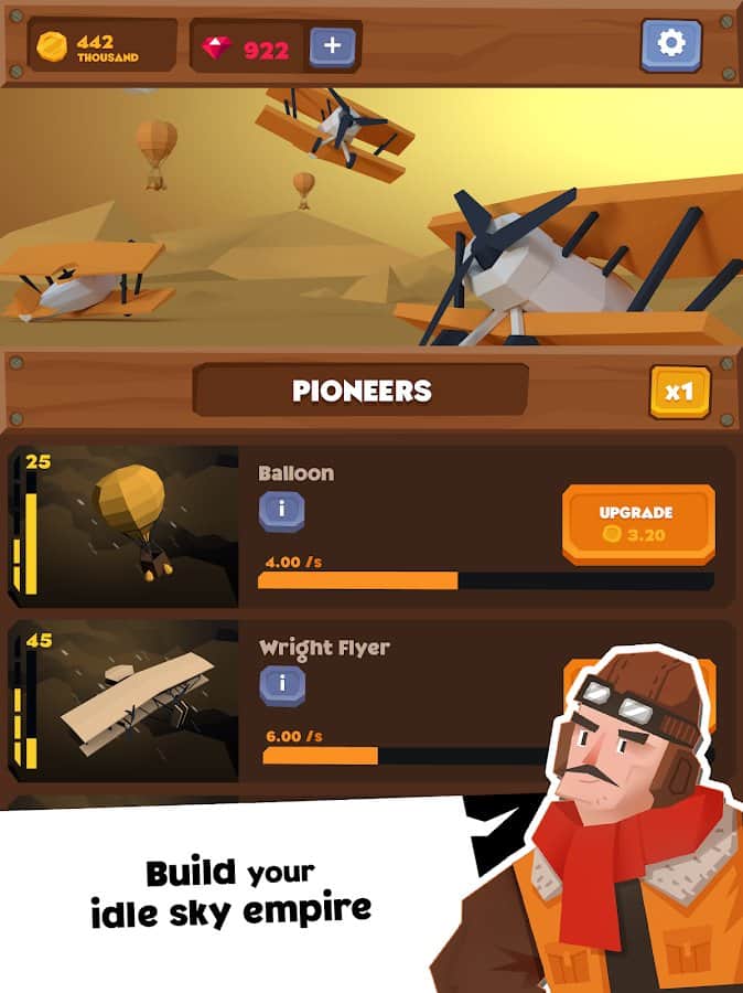 Idle Skies - аркадний кликкер з елементами дослідницької стратегії в якій вам належить відправитися в захоплюючий світ повітряних суден і постаратися розвинути своє підприємство від створення простеньких біпланів до будівництва сучасних реактивних літаків. Широкий вибір техніки, система розвитку, повна підтримка російської мови все це сподобатися шанувальникам стратегій і любителям авіації.