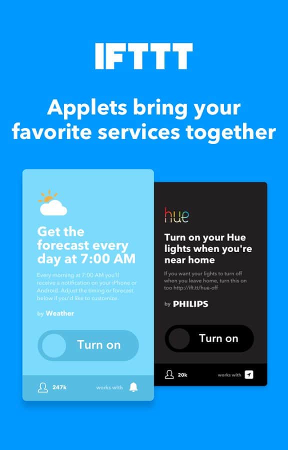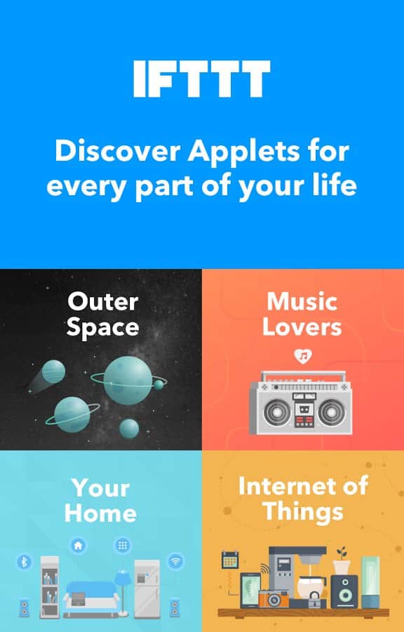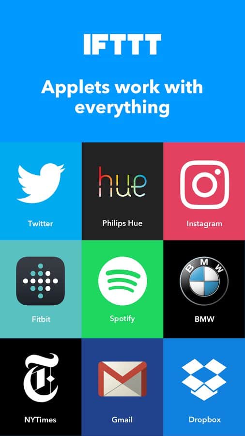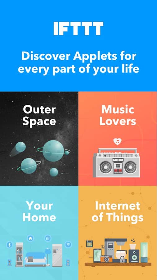 IFTTT - Цікаве додаток з вельми незвичайним функціоналом. Це багатофункціональна складання різних програм і сервісів, які не тільки допоможуть вам будуть корисні, але так само мають в собі одну унікальну функцію. З його допомогою ви зможете комбінувати різні сервіси та створювати абсолютно нові додатки. Наприклад якщо об'єднати гугл карту з сервісом з нерухомості ви зможете побачити їх на крате. Так само ви зможете створювати швидкий доступ.