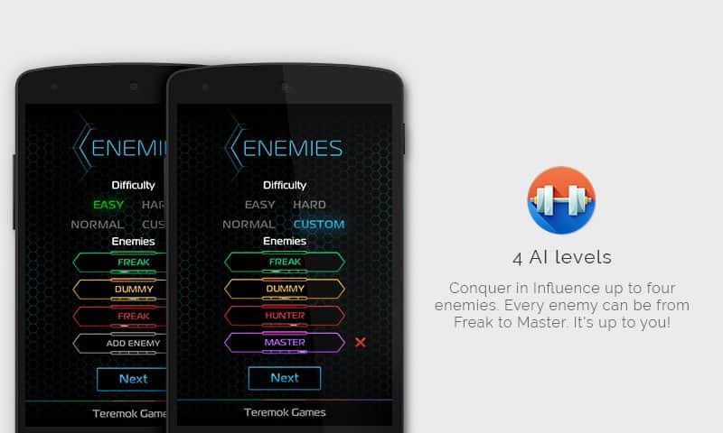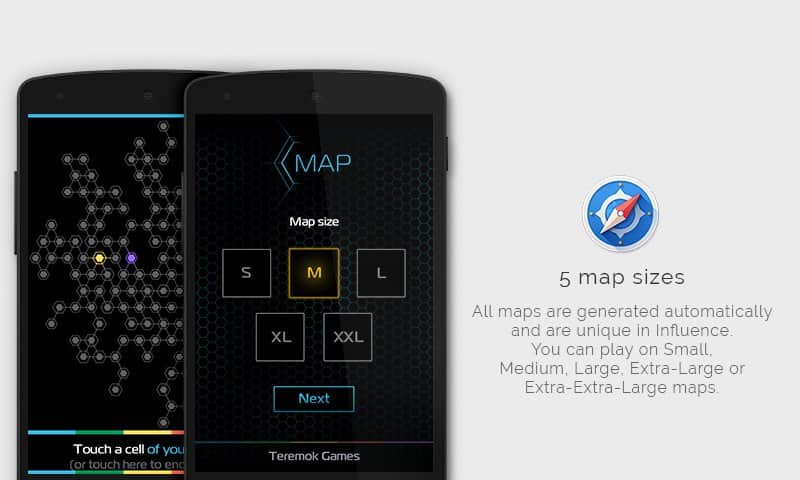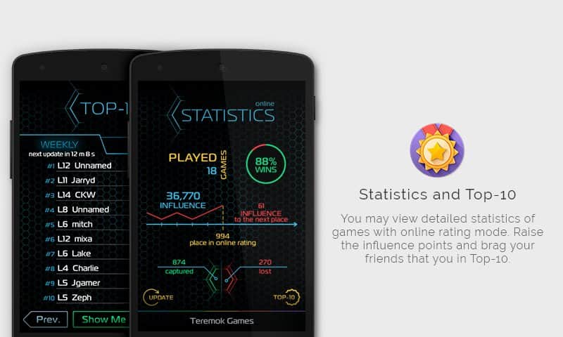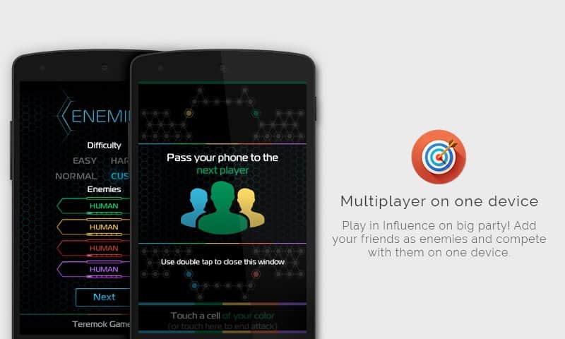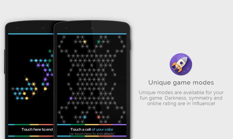 Influence (Вплив) - Ця чудова гра затягне будь-якого любителя стратегій. Суть гри дуже проста, вам потрібно захопити всі крапки на карті, зробити це можна за допомогою своїх точок. Чим більше у вас буде території тим більше очок ви отримаєте розподілу, однак так само ви станете пріоритетним ворогом для своїх супротивників. Найцікавіше в цій грі так це те, що всі будуть в однакових умовах, карта повністю симетрична та й до того ж необов'язково грати з ІІ, ви можете викликати на бій реального людини і грати онлайн займаючи більш високі позиції в рейтингу.