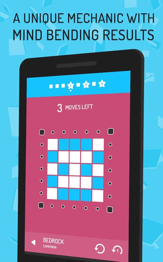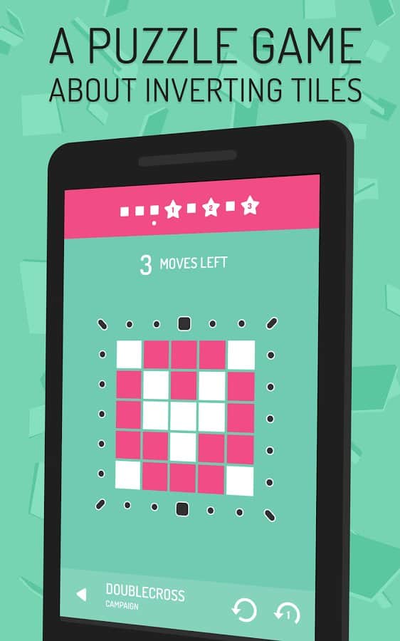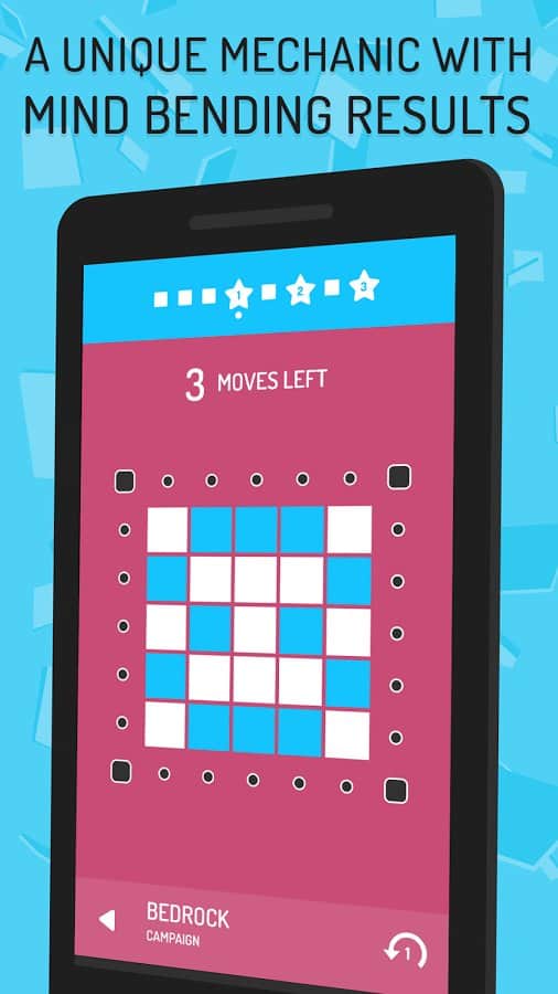 Invert - A Minimal Puzzle Game – відмінна головоломка на андроїд, де ви буде фарбувати плитки в один колір. У цій грі перед вами відкриється поле, на якому розміщені плитки і вашим завданням буде перевертати їх так, щоб вони забарвилися в один колір. Рішення таких завдань не займе у вас багато часу, якщо ви будете ретельно продумувати кожен свій крок і проходити рівні, витрачаючи якомога менше ходів. У грі ви знайдете три режими гри: