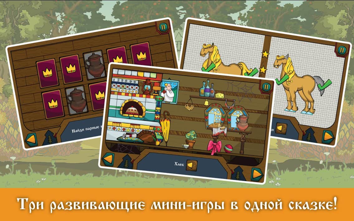 Іван-царевич і Сірий вовк - чудово ілюстрована казка для дітей дошкільного віку. У цій казці - грі ваша дитина знову познайомитися з уже знайомими йому героями Іваном-царевичем і Сірим вовком. Графіка цієї гри виконана в традиціях російської ілюстрації, де ви і ваша дитина зможе весело проводити час, розвиваючись і допомагаючи Івану – царевичу вирішувати непрості завдання. У грі є три захоплюючі міні ігри, такі як: «знайди предмет», «memory» і «знайди відмінності» які обов'язково сподобаються вашій дитині. Грайте в цю гру зі своєю дитиною і прищеплюйте йому смак до гарних ігор.