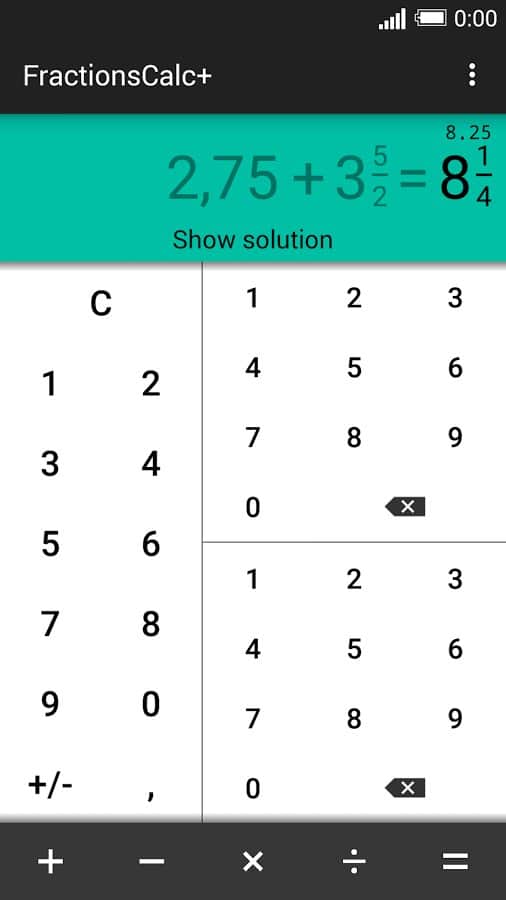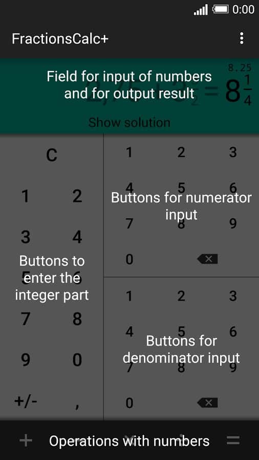 Калькулятор дробів / FractionsCalc+ - красива і якісна програма для виконання дій з дробами. Додаток має простий і доступний інтерфейс, присутня функція скорочення дробу і додатковий вивід результату у десятковому форматі, а так же висновок докладного ходу рішення.