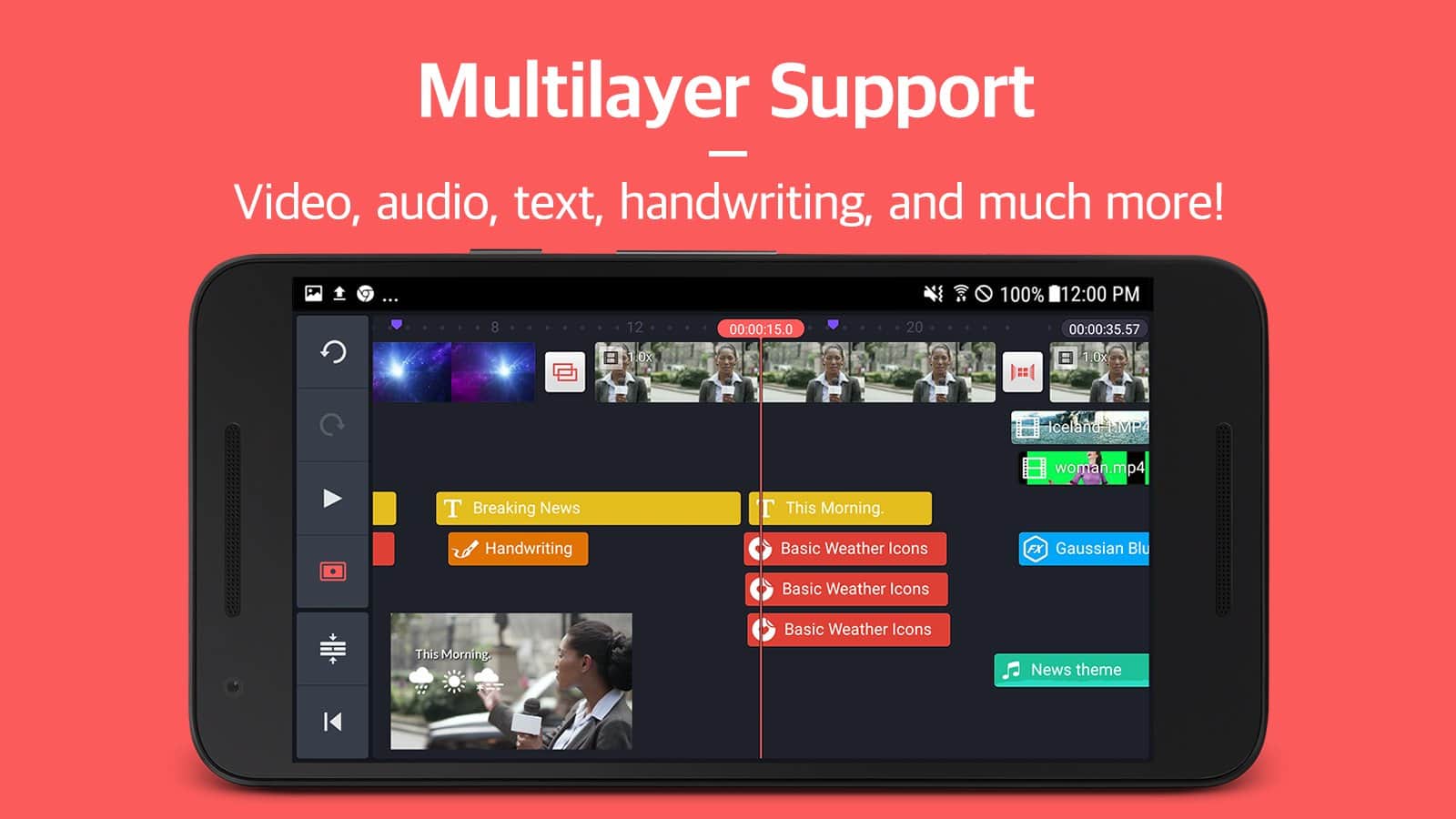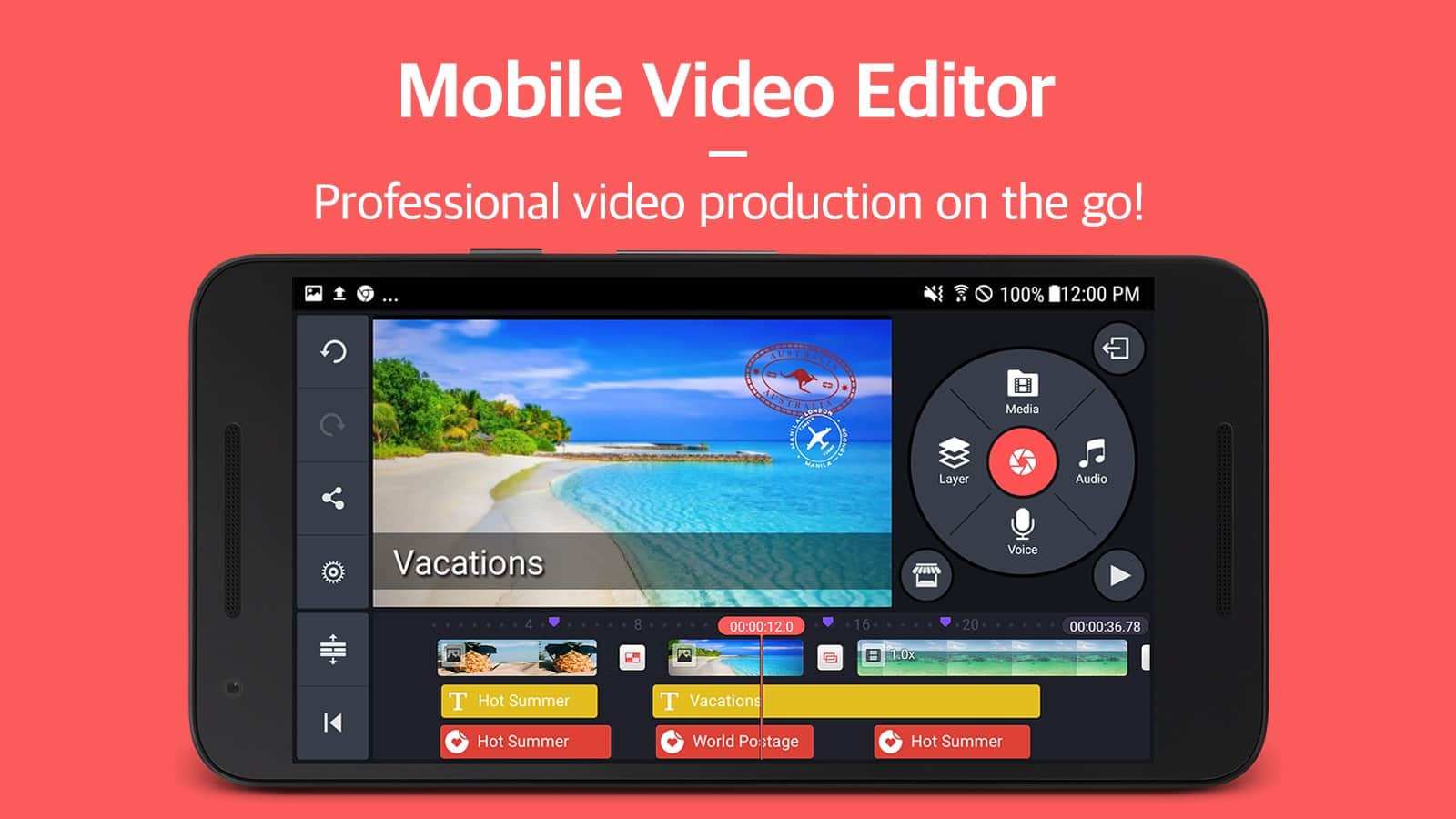 KineMaster - Pro Video Editor – из огромного количества представленных на рынке видеоредакторов, KineMaster выгодно отличает работа в формате FullHD (1080p). Остальные особенности программы менее специфичны, но не менее интересны: поддержка drag-and-drop, обрезка ролика, применение разнообразных фильтров и эффектов, вроде вращения, трехмерных переходов, картинки в картинке. Для создания своего фильма вы можете использовать видео в форматах MP4, 3GP, MOV, музыку в MP3, M4A, AAC и фото или другие изображения в JPG, PNG.