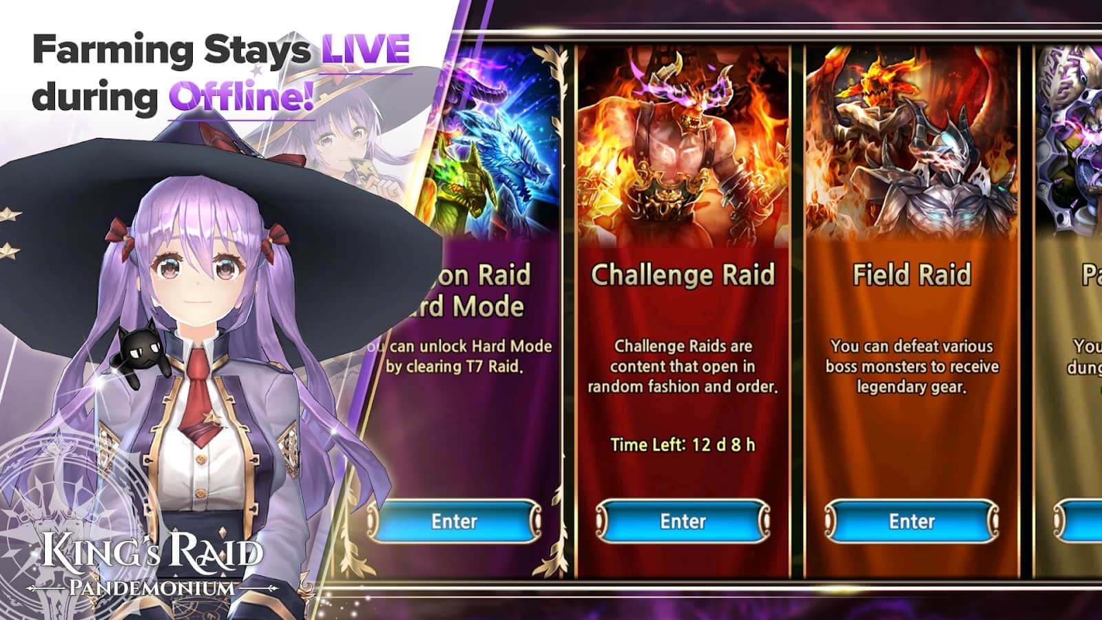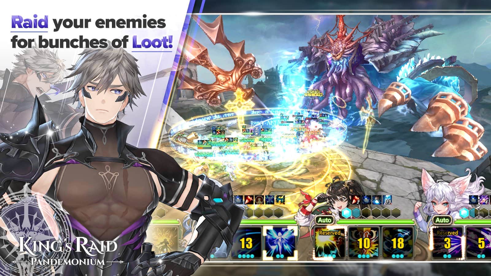 king's Raid – прийміть участь у битві проходить в реальному часі і зберіть свою непереможну команду рейдерів. Вибирайте собі героя з представлених в грі персонажів і наделяйте його унікальною зовнішністю і здібностями. Вирушайте в подорож, де вам належить битися з сильними супротивниками і здолати їх. Одночасно в цю гру можуть грати до дев'яти осіб і виконувати різні завдання битися з босами, влаштовувати рейди, кидати виклик суперникам або перемогти світового боса. Використовуйте в бою свої вміння і здібності, які прокладуть шлях до перемоги. Поєднуйте різні навички і досягнете вершини майстерності. Візьміть участь у фінальній битві і переможете всіх суперників.