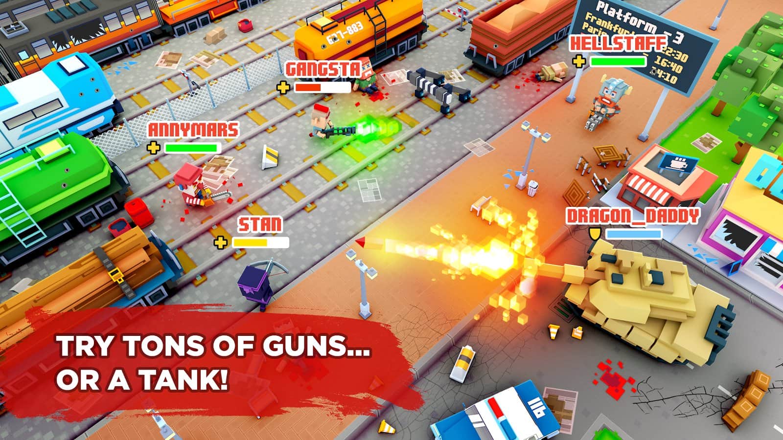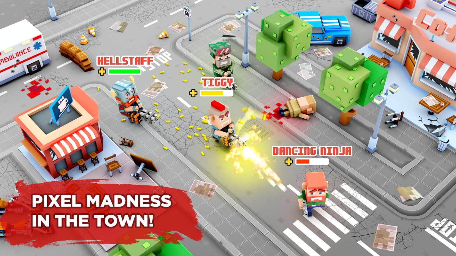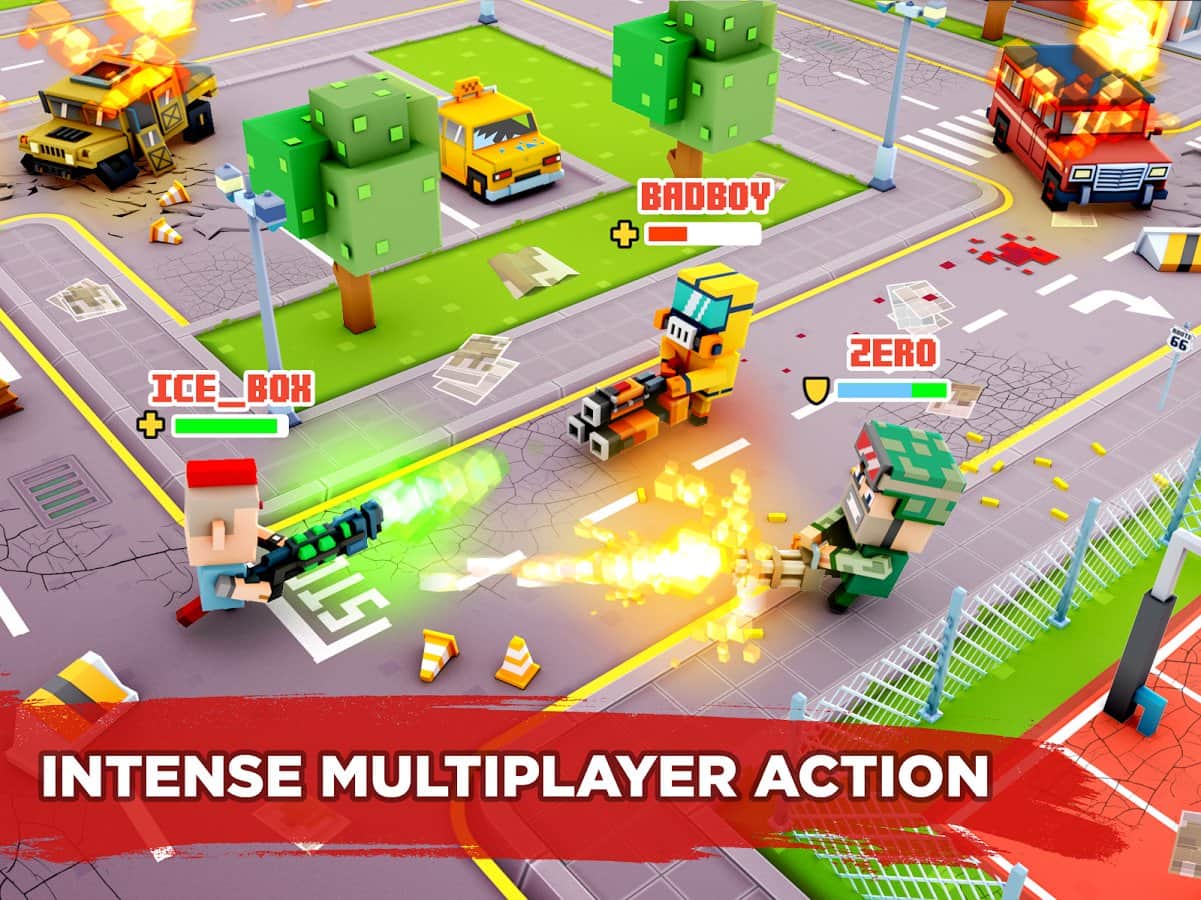 Kings of Guns – відмінний шутер на андроїд, з виглядом зверху, де ви візьмете в руки зброю і будете знищувати все живе в цьому місті. У цій грі ви опинитеся в світі після зомбі-апокаліпсису, де всі живі люди перетворилися на зомбі, і навіть ті хто залишився в живих став вашим запеклим ворогом. За допомогою потужного зброї, такого як: пістолет, дробовик, АК-47, базука, вогнемет, бензопила, а також трактор і танк знищуйте не тільки зомбі, але і інших гравців пересуваються по карті. Почніть грати прямо зараз і кидайте виклик самим кращим гравцям і своїм друзям. Ведіть вогонь по рухомих мішенях і намагайтеся вижити в цьому небезпечному світі.