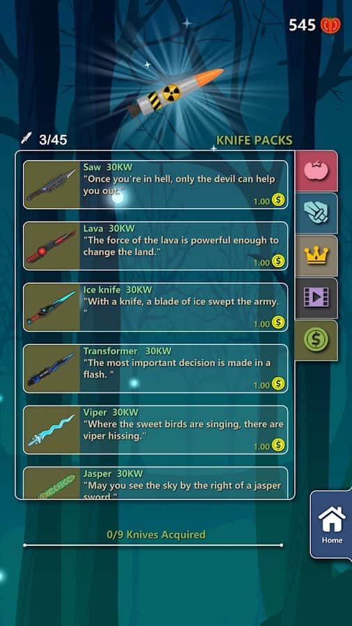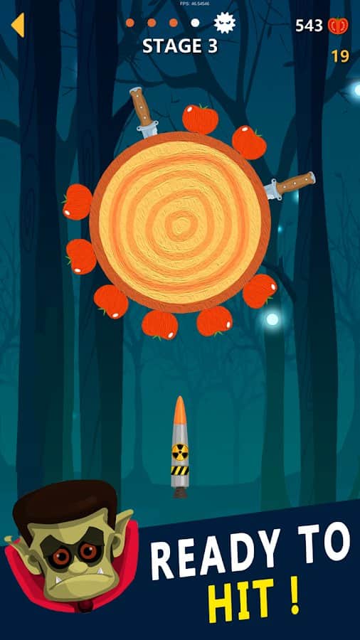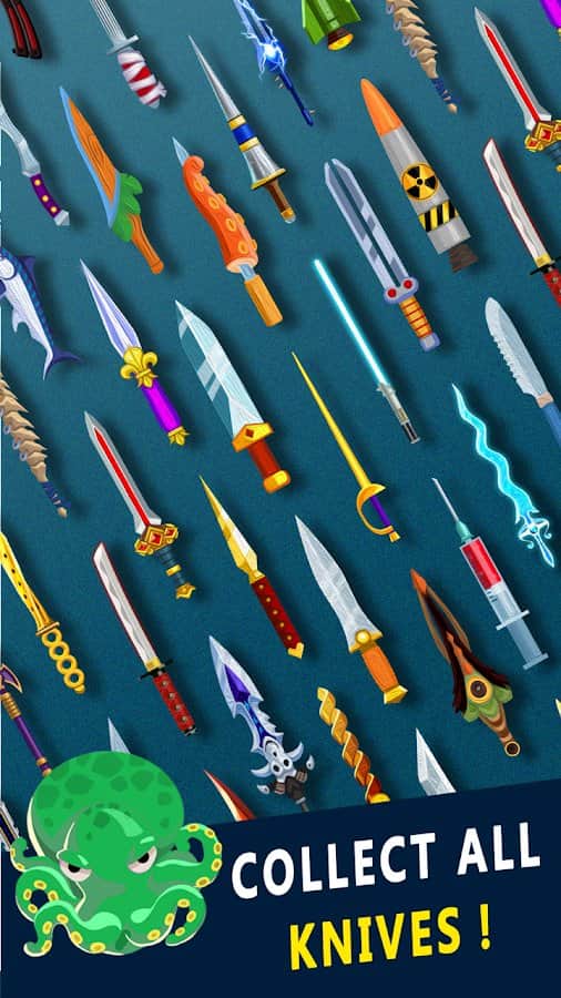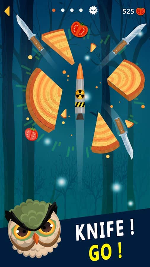 Knife Go! – захоплююча гра на андроїд, де ви будете кидати гострі ножі в мішень. Складність гри полягає в тому, що мішень обертається і хаотично змінює напрямок обертання. Підключайте всю свою спритність пальців і відмінну реакцію і кидайте ножі точно в ціль при цьому прагніть не потрапляти в ножі, які вже є на мішені. У потрібний момент торкайтеся екрану свого телефону або планшета і намагайтеся при цьому дозволяти яблука і інші бонуси, попадаються вам на шляху. Зберіть свою неповторну колекцію ножів і переможете сильних босів.