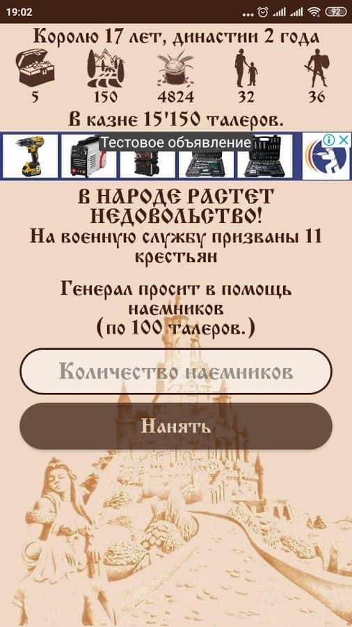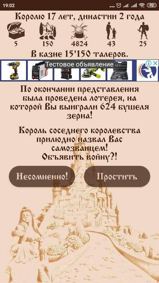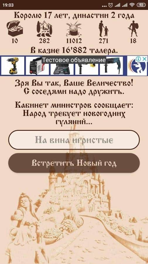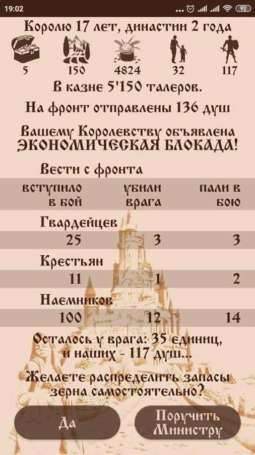 Королівство Ейфорія – відмінна головоломка на андроїд, де ви будете виступати в ролі короля. В грі ви станете правителем королівства Ейфорія і будете виконувати різні місії і завдання гри. Ваше королівство має багато золота, грошей, солдатів, їжі і земель. Ви повинні грамотно управляти всім цим при цьому розвивати і розширювати своє королівство. Але навіть король не може бути впевненим у завтрашньому дні. У вас може померти королева, селяни можуть підняти бунт, не врожай чи знайдеться злодій, крадущий з казни гроші.