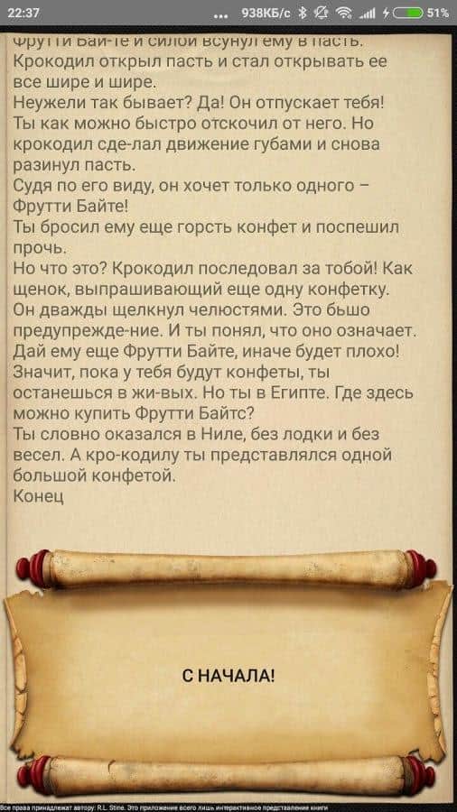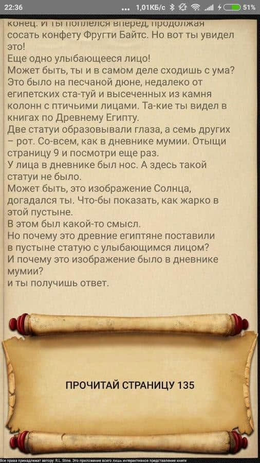 Квест: Щоденник Божевільної Мумії – інтерактивна гра на андроїд, створена за сюжетом знаменитої з дитинства книги. У цій грі ви поринете в захоплюючу історію і зможете впливати на її результат. У цій грі ви будете грати роль хлопчика, який знайшов щоденник мумії і тепер вашим завданням буде допомогти йому врятуватися від усіх напастей і неприємностей, які чекають його попереду. Вирішуйте складні задачки і головоломки і впливати на сюжет своїм вибором. Підключайте свою фантазію і пройдіть всю гру, в якій передбачено 20 кінцівок.
