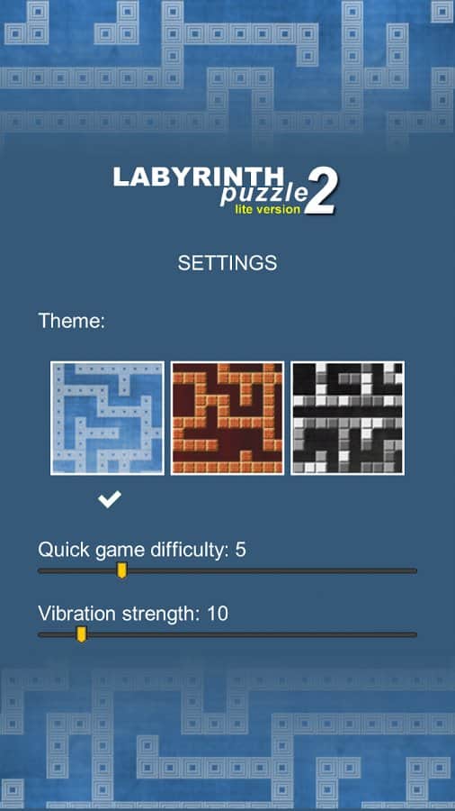 Labyrinth puzzle lite 2 – цікава гра на андроїд, де вам належить катати кульку по лабіринту. Ця нова версія гри «Лабіринт» порадує гравців декількома режимами гри, трьома різними темами оформлення і більше 20 складними і неповторними рівнями. За допомогою нахилів телефону або планшета катайте кульку по лабіринту і шукайте найоптимальніший шлях, який приведе вас до перемоги. Пройдіть рівень за мінімальний проміжок часу і встановіть свій рекорд у цій грі. У грі представлено два нових режиму «Марафон» і «Темрява». Перший режим ви повинні пройти за певний час, а другий режим в повній темряві, користуючись підказками.