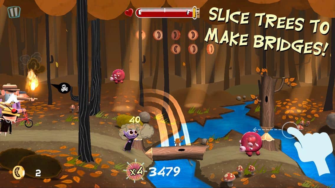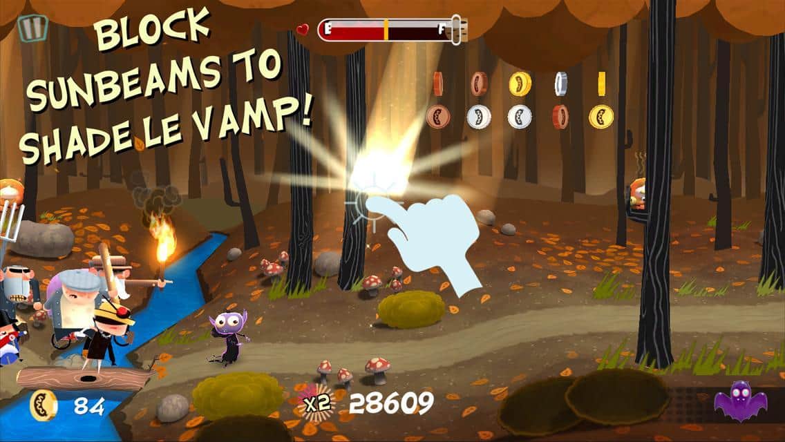 Le Vamp - яркая аркада для андроид, в которой вы играете за маленького вампирчика, который идет по лесу. Его путешествие не такое уж и безопасное, поэтому без вашей помощи ему не обойтись! Преодолевайте препятствия вместе, пилите деревья, чтобы проложить путь через реку, оберегайте вампирчика от солнечных лучей, подкармливайте малыша поросятами. Кроме того, собирайте бонусы и справляйтесь с врагами! Вообщем, скучать не придется!