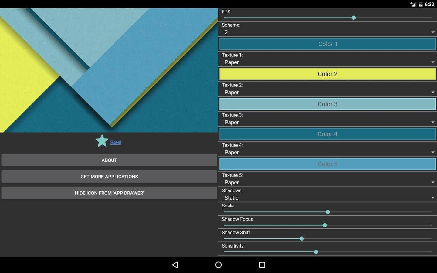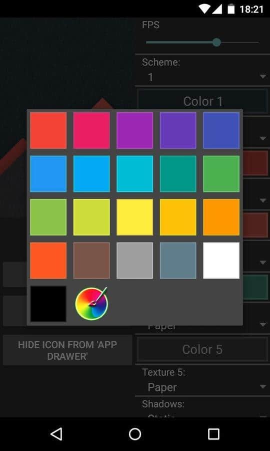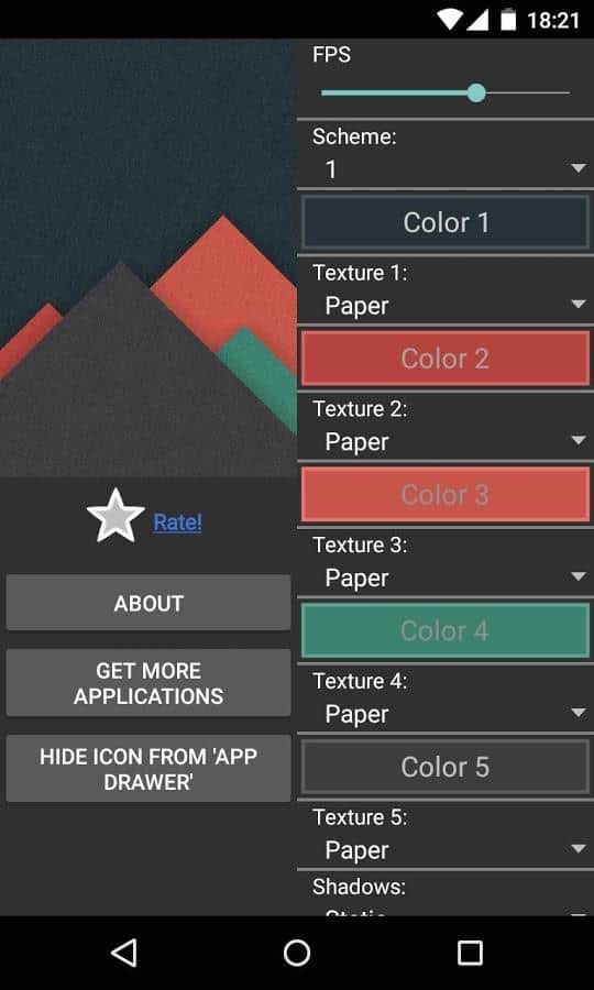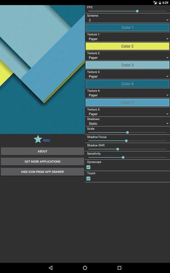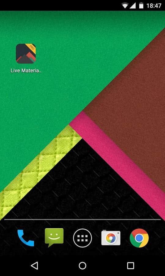 Live Material Design – спробуйте встановити собі нові анімовані живі шпалери, що складаються з декількох фрагментів різнобарвною плитки. Живі шпалери інтерактивні що відмінно підходить людям, яким все дуже швидко набридає. Вибирайте самі колір і матеріал і насолоджуйтеся якісними живими шпалерами.
