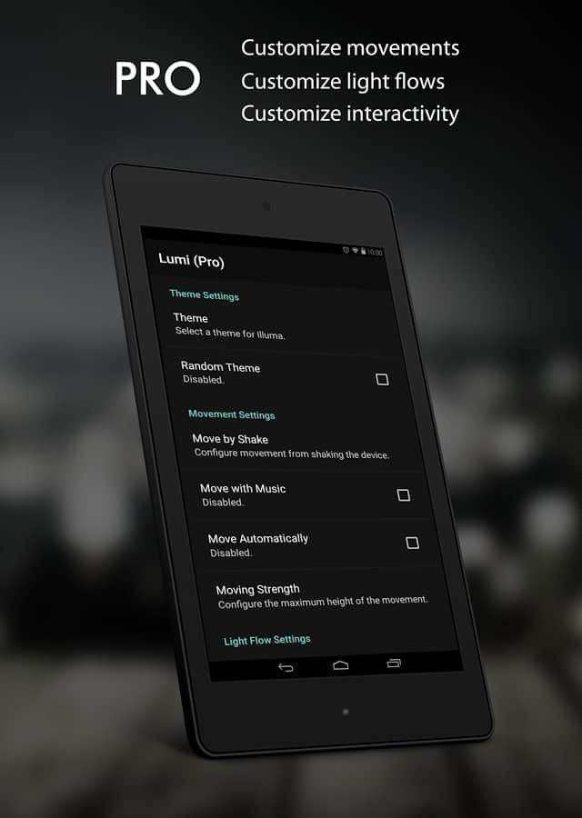 Lumi Live Wallpaper Deluxe - Красиві живі шпалери для вашого робочого столу, які будуть анімувати ваші дії. Тут ви знайдете дуже барвисті і по-справжньому живі шпалери, в теж час вони будуть досить прості і без надмірностей. Вони дуже забавні тим що підсвічують ваші натискання на екран, при цьому мають дуже ніжну, переливається анімацію. Так само, за допомогою різних налаштувань, ви можете змусити їх рухатися самостійно, або ж в той момент коли ви встряхнете свій смартфон.
