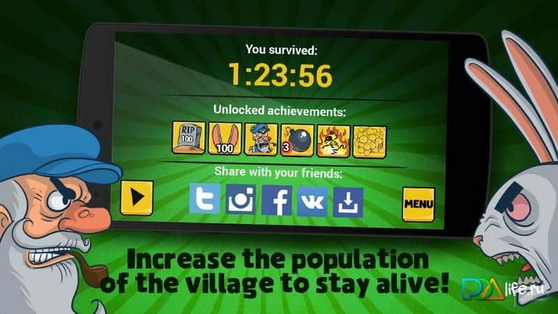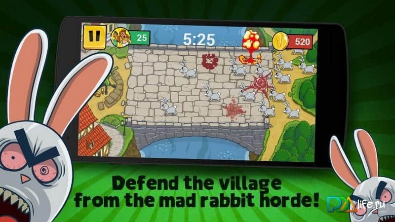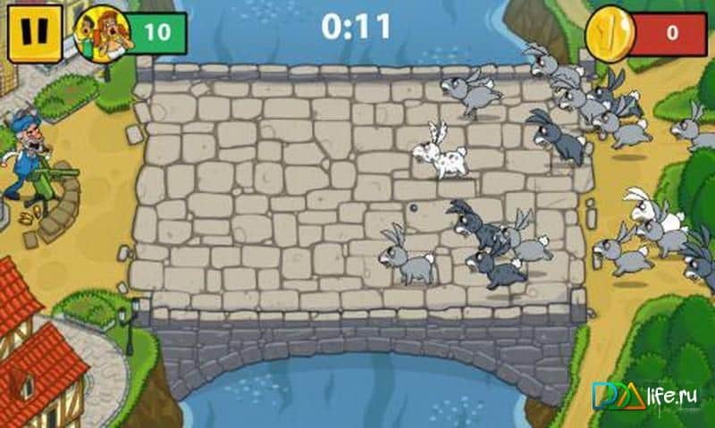 Божевільні Кролики: Відстріл – не знаю навіть якихось грибів об'їлися лісові кролики, але вухаті уявили, що вони можуть так просто вийти з лісу і відправиться завойовувати невелике містечко. На шляху до міста є місток, через який і йдуть юрби зайців, але їм перепинив відважний старий захисник, можливо це дід Мазай вирішив виправити свою давню помилку, а може просто зайчатинки захотілося скуштувати, але це вже не так важливо. Головне що у нього значний арсенал для відстрілу косих, і ми їм неодмінно скористаємося. Мочимо зайцев, збираємо монети, прокачуємо зброю, знову мочім зайцев, їмо пельмені з дичиною, знову прокачуємо гармату, шиємо шапки і так поки вухатих повністю не переб'ємо.
